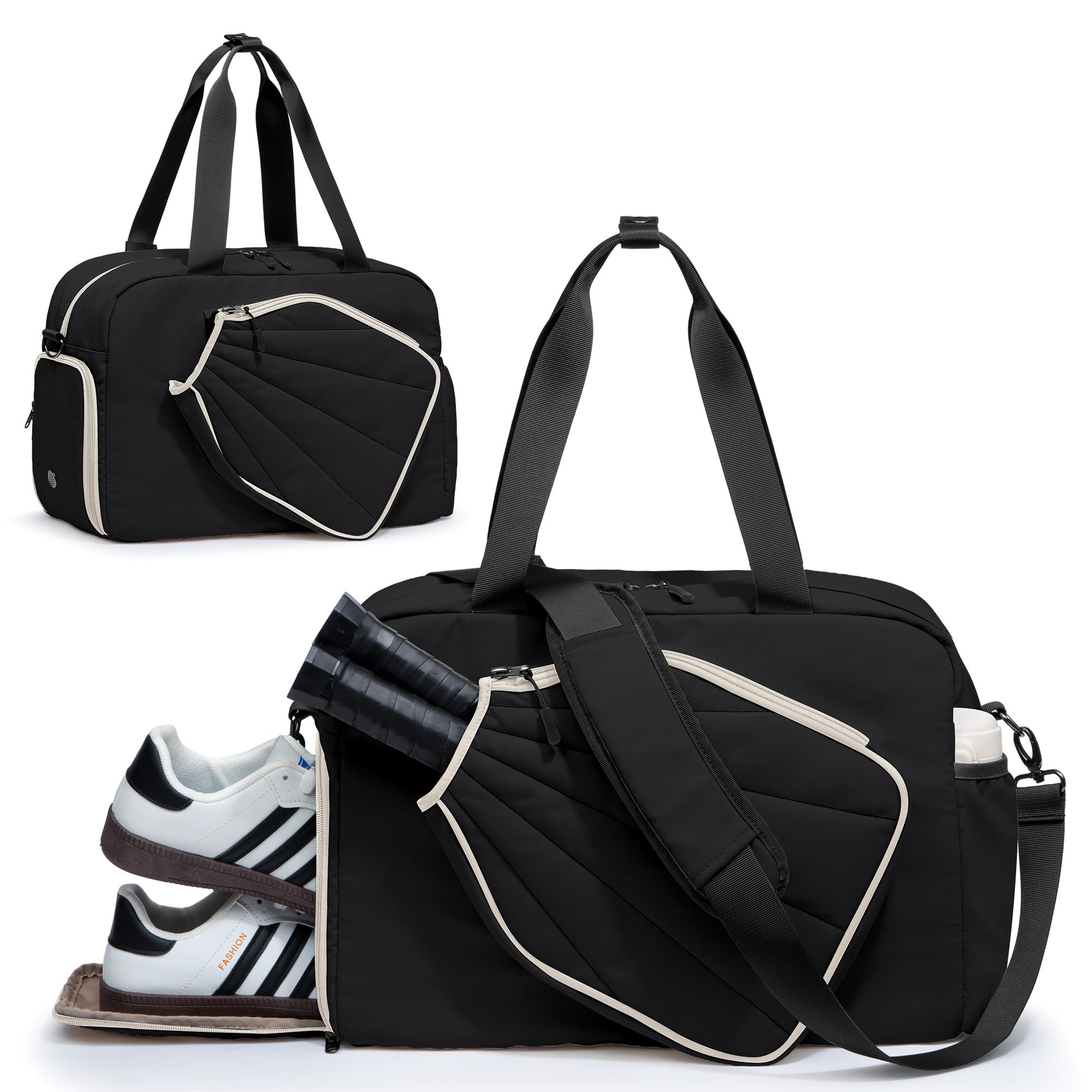 Pickleball Tote Bag for Women with Exterior Paddle Pocket and Separate Shoe Compartment, Pickleball Bags with Wet Pocket and Detachable Strap, Black