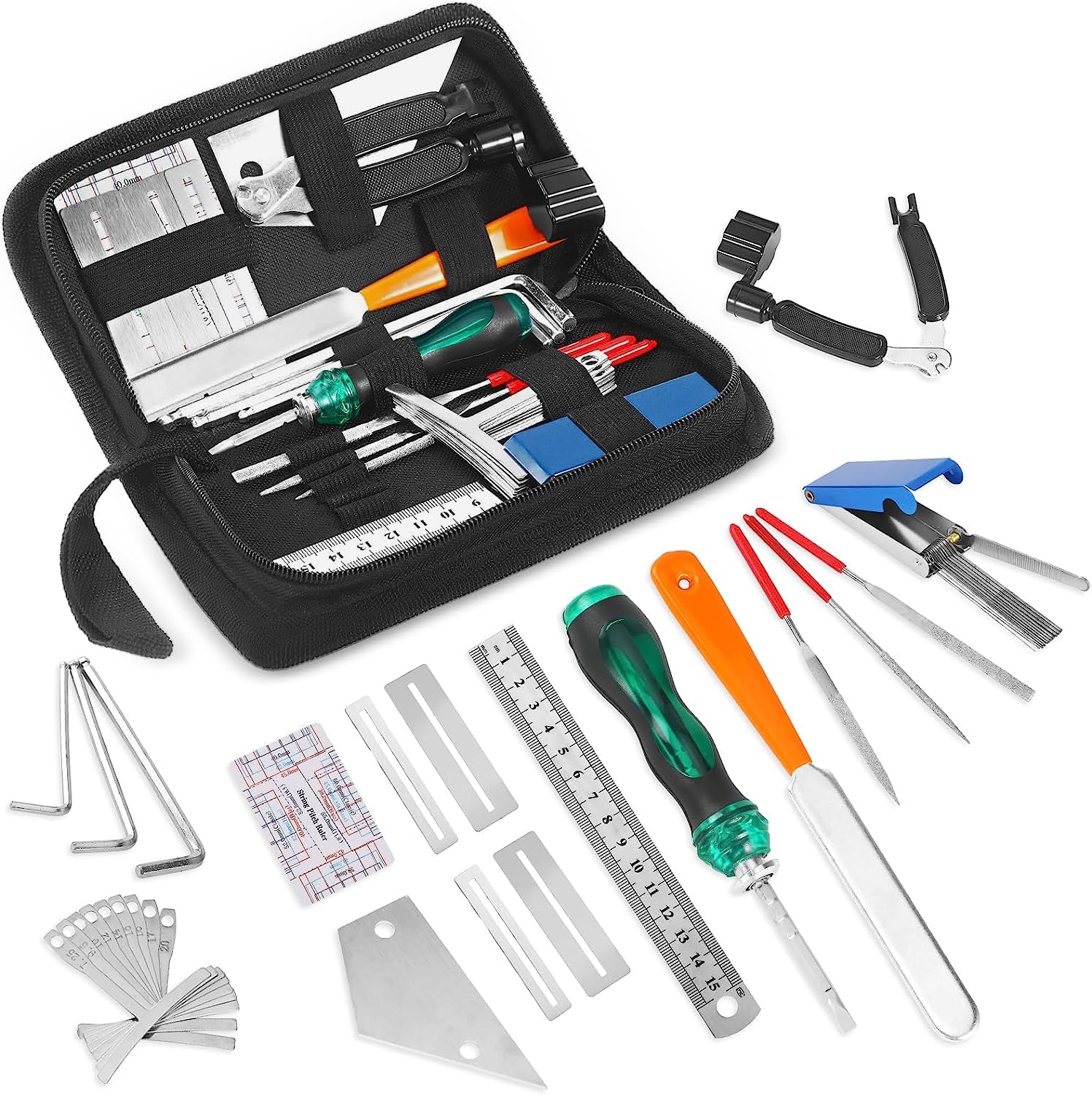 [VALUE FOR MONEY] This guitar tool kit comes with a fret file, a dual purpose screwdriver, a steel ruler, a guitar nut file, 3 Hex wrenches,3 diamond files, a piece of 3 in 1 string cutter, 9 stainless steel under string radous gauges, a fet leveling ruler, a string action ruler, 4 fret board guards and a storage bag.