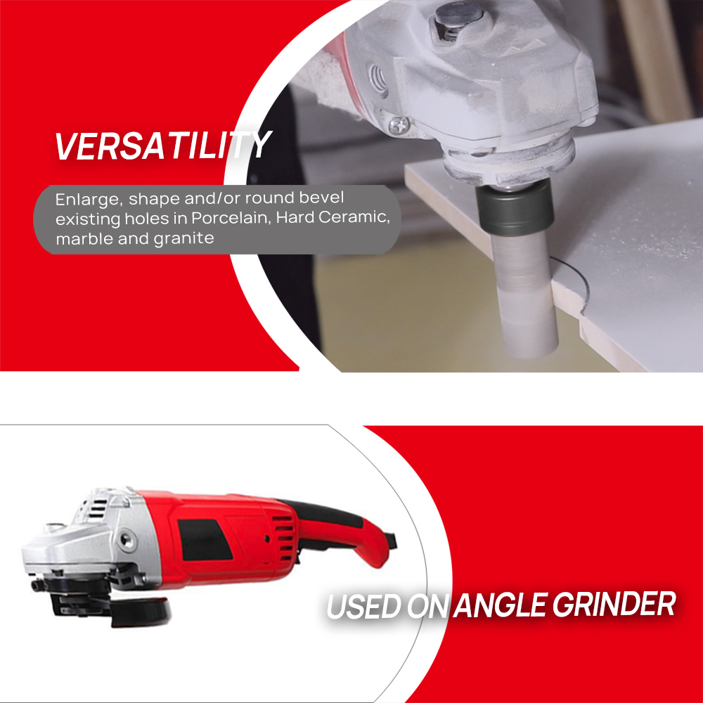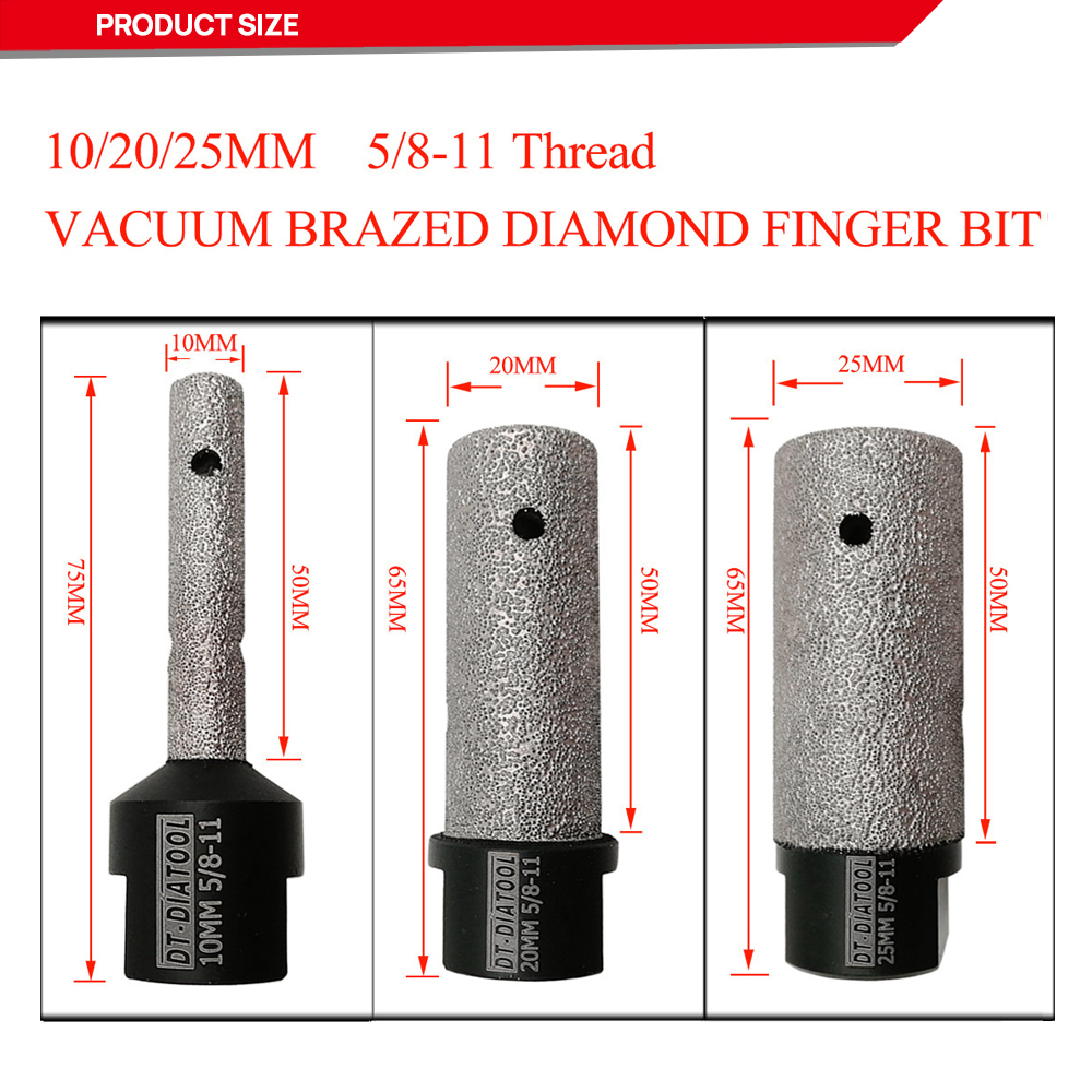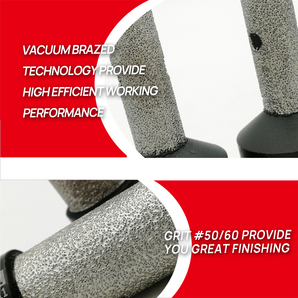 Product Name: Vacuum Brazed Diamond finger bits Milling bits for tile, stone, countertop Specification: 25MM Diameter, 50MM workable length, 5/8-11 connection, Total Length: 65mm, Grit #50/60 (NOTE: 5/8-11 Thread, it's usually suitable for North America Market, please attention!) Quantity: 2pcs Application: Enlarge, shape and/or round bevel existing holes in Porcelain, Hard Ceramic, marble and granite Vacuum brazed technology provide high efficient working performance Grit #50/60 provide you great finishing Also available to make a hole directly, but not recommend to do this job. Very easy to operate. Used on angle grinder ================THE END================ Available diameter: Dia 10mm, 20mm, 25mm