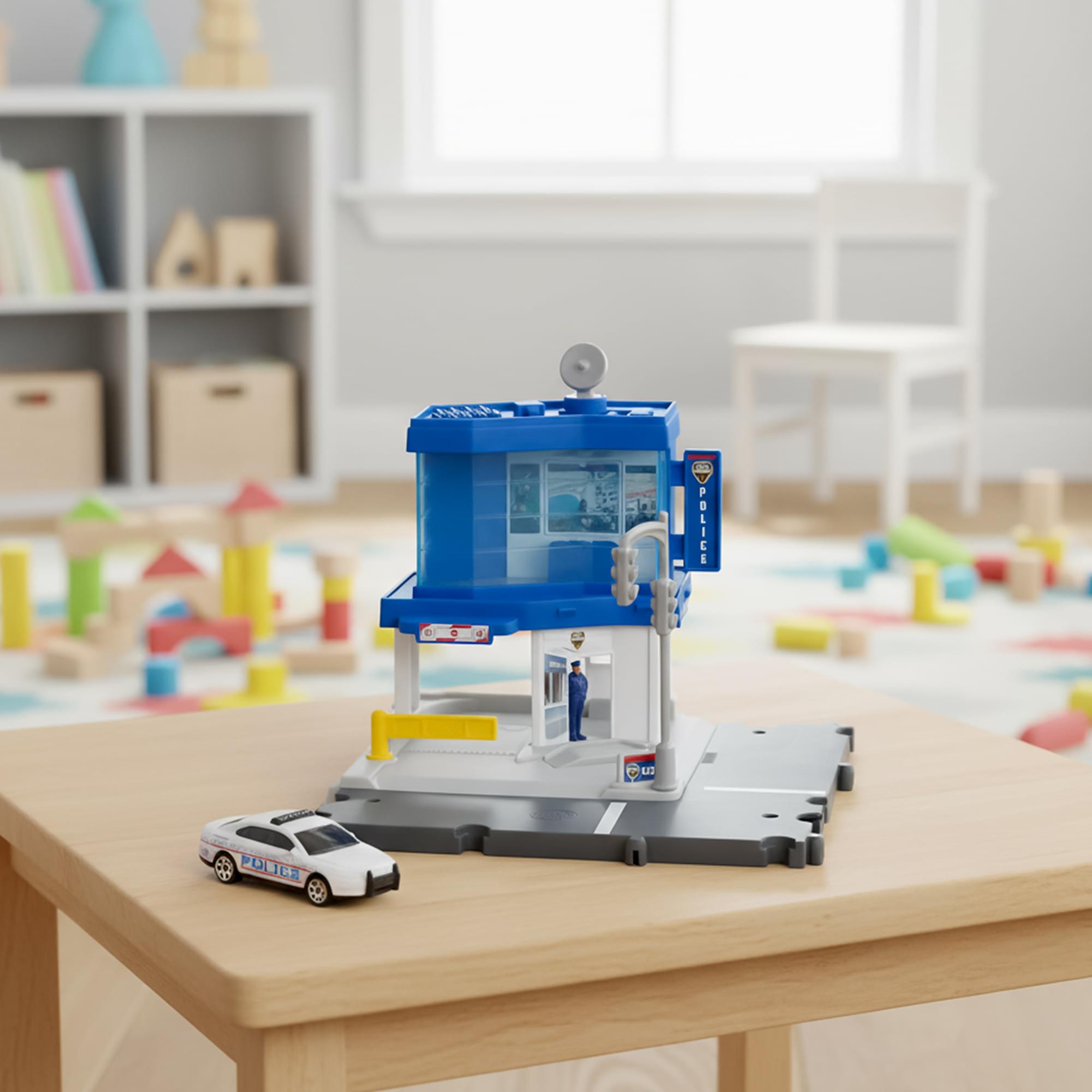 • Fun Feature: The set features kid- and car-activated features like a rotating satellite that changes the control room monitor and a figure that moves when a vehicle approaches.