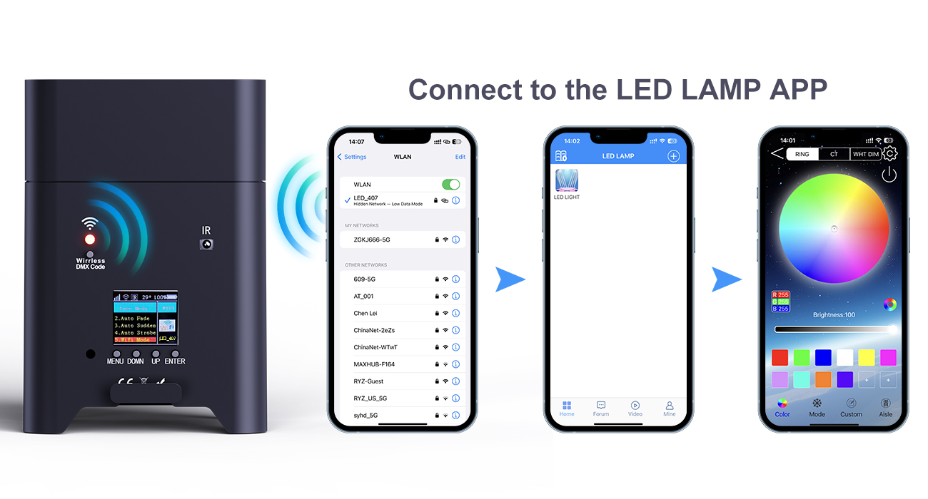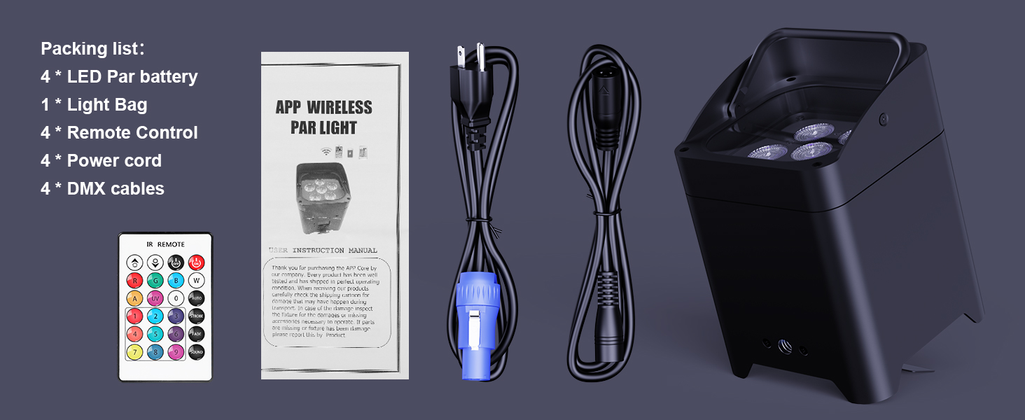 6. Support wired and wireless DMX: Support wired and wireless DMX control methods, you can control the lamps through WIFI signals to achieve more flexible lighting effects.