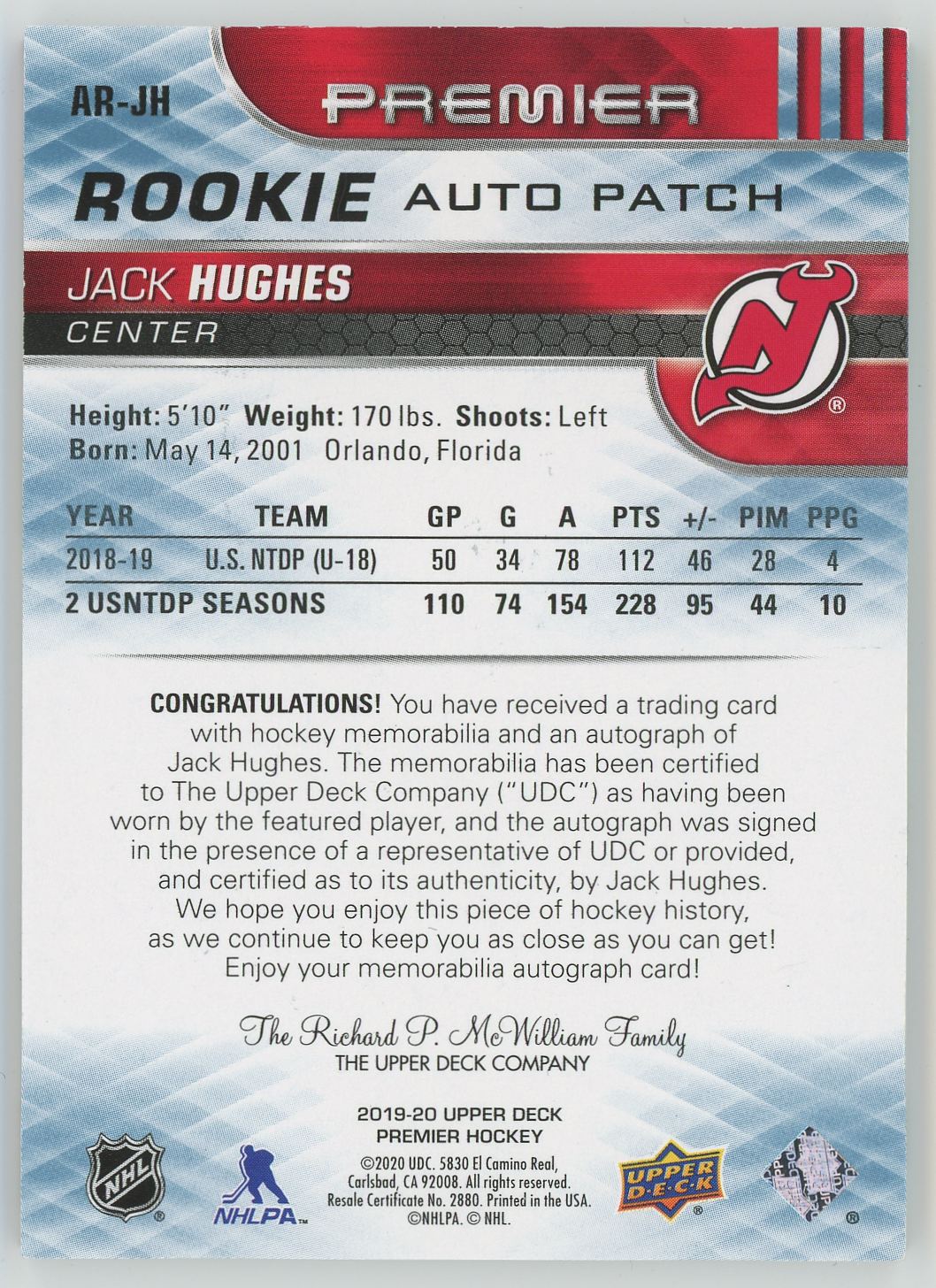 | 2019-20 Upper Deck Rookie Auto Patch 1of1 Jack Hughes #AR-JH | ||||||||||||||||