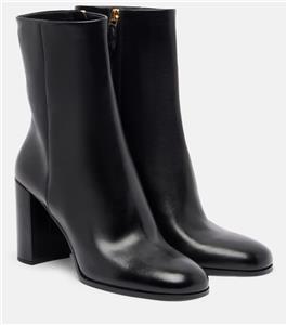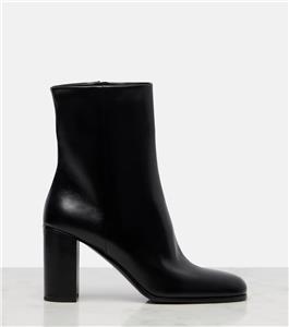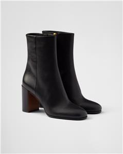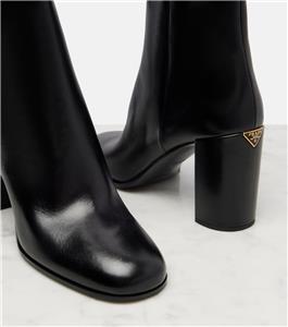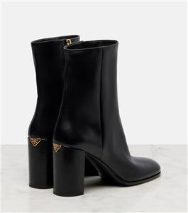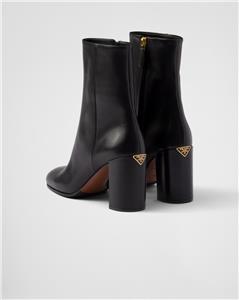 Prada embodies modern sophistication, blending timeless Italian craftsmanship with an innovative spirit. These ankle boots are crafted from supple leather with round toes and feature 85mm block heels adorned with golden triangle logos.