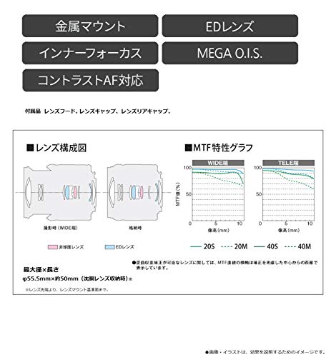 H-FS35100K* retractable mechanism adopted can be stored in a compact. Lighter mass about 135g telephoto zoom lens compact and lightweight telephoto zoom lens 70 ~ 200 mm was realized. Mobile at the time by the retraction mechanism adopted can be stored compactly. Employs a metal exterior / metal mount is finished in high-quality appearance. * not miss a photo opportunity in the high speed AF. High-speed, high-precision contrast AF of 240fps drive corresponding 240fps drive. You can quickly focus on a moving subject. * equipped with "optical image stabilization (MEGA O.I.S.)" which detects camera shake and reduce the optical image stabilization mounted within the lens that enables stable framing during telephoto shooting. The unique control algorithm, the gyro sensor output per second 4000 times in high-speed processing, also accurately correct a slight shake. [Accessories], lens caps, Lens rear cap, lens hood / * regard your order is, I need your help by one per person. Multiple purchase please refrain. * such as your order by changing the name at the same address, if we receive multiple orders from the customer, which seems to be the same, please understand that some may be allowed to cancel your order. * Micro Four Thirds lens