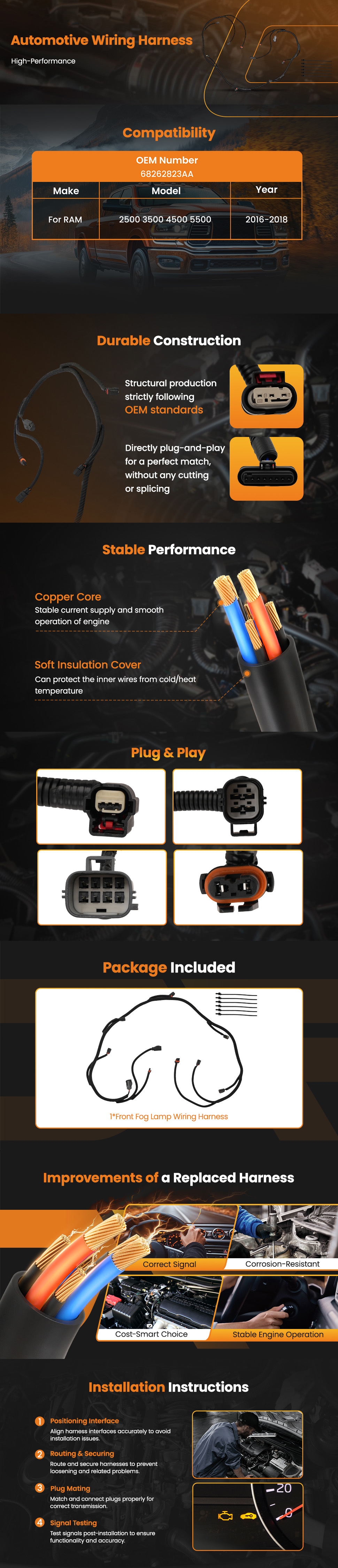 Fog Light Wire Harness for RAM 2500 3500 4500 5500 2016-2018 w/ Park Assist