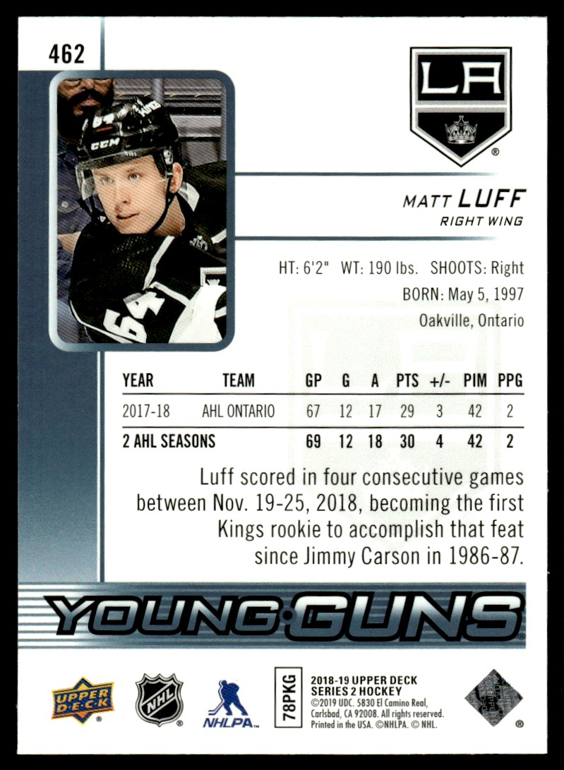 | 2018-19 Upper Deck Young Guns Matt Luff Rookie Los Angeles Kings #462 | ||||||||||||||||||