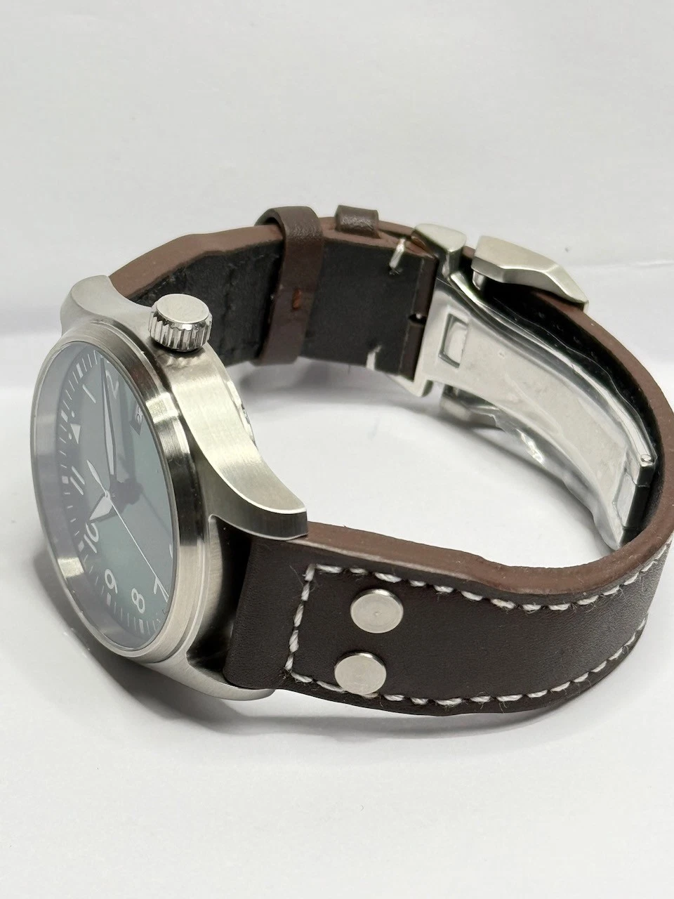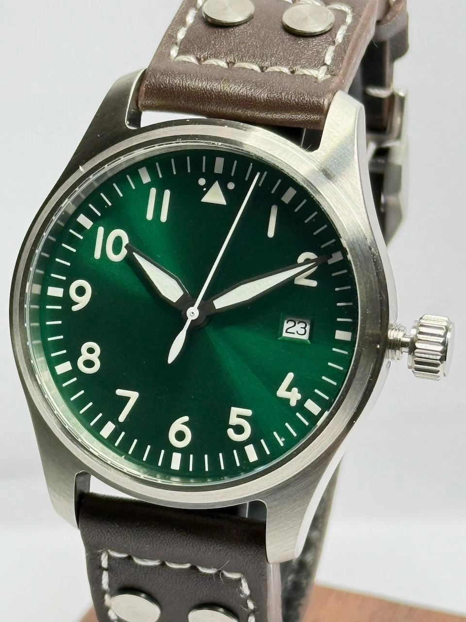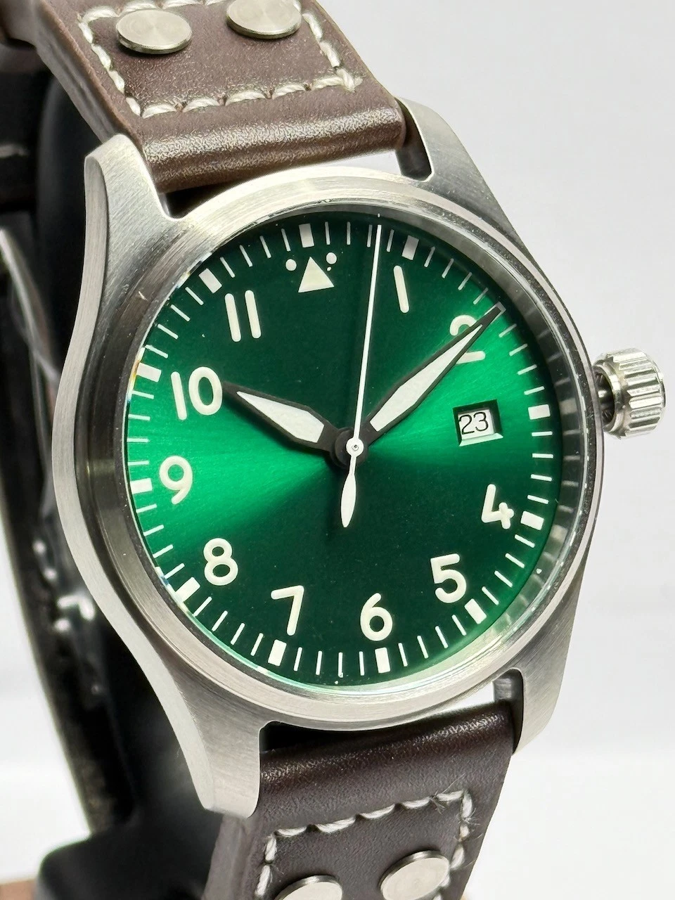 Il quadrante verde con numeri arabi e indici luminosi, combinato con un cinturino in pelle marrone di alta qualità, rende questo orologio un compagno elegante per ogni occasione. L'orologio ha un movimento automatico ad alta precisione PT5000, che abbiamo in tre posizioni regolato con precisione su una deviazione della tariffa giornaliera di +/- 5 secondi divenne. C'è di più un vetro zaffiro con rivestimento antiriflesso su un lato.