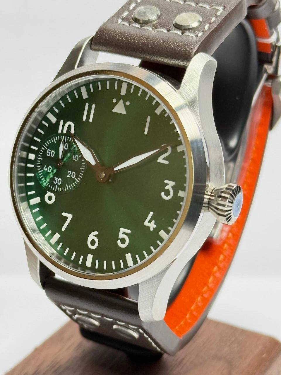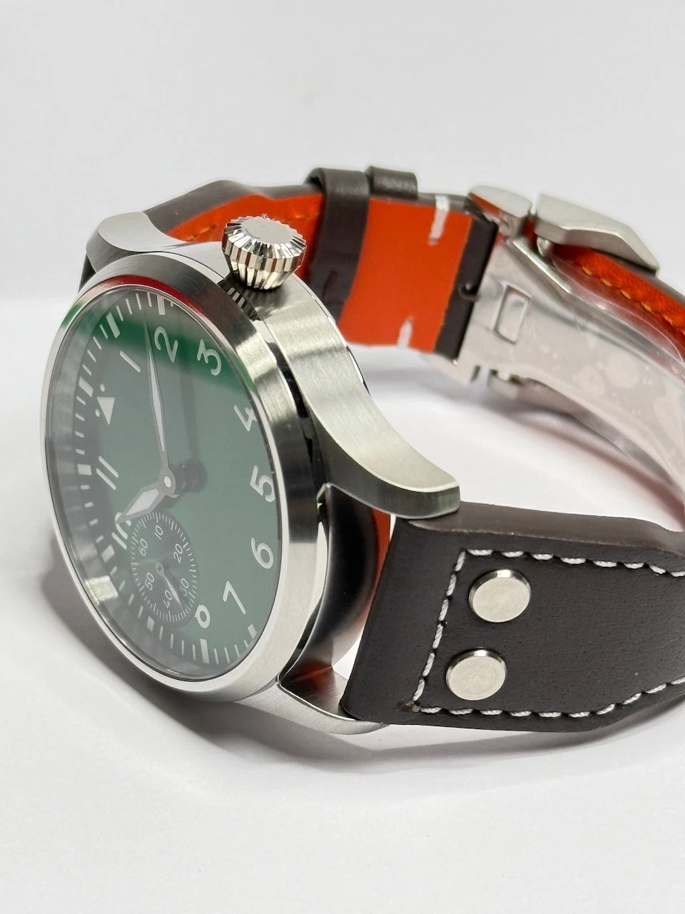 Questo bellissimo orologio è alimentato da uno movimento a carica manuale autentico Sea-Gull ST3600. Questo orologio è a Clone del leggendario svizzero ETA 6498 Movimento a carica manuale quello è stato regolato da noi nel modo più preciso possibile in tre posizioni.
