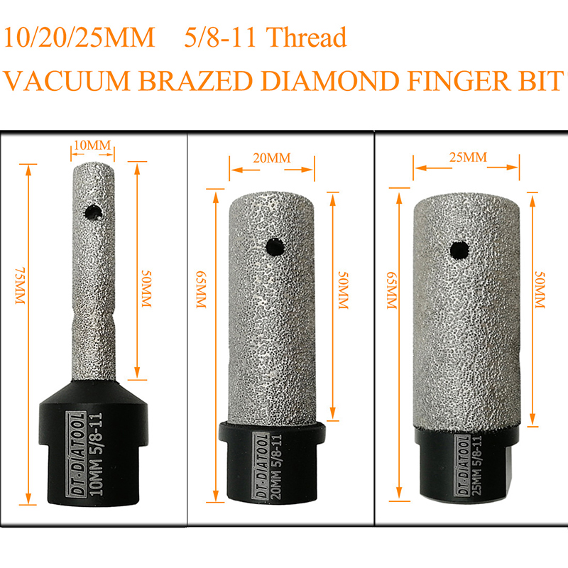 Product Name: Vacuum Brazed Diamond finger bits Milling bits for tile, stone, countertop Specification: 20MM Diameter, 50MM workable length, 5/8-11 connection, Total Length: 65mm, Grit #50/60 (NOTE: 5/8-11 Thread, it's usually suitable for North America Market, please attention!) Quantity: 2pcs Application: Enlarge, shape and/or round bevel existing holes in Porcelain, Hard Ceramic, marble and granite Vacuum brazed technology provide high efficient working performance Used on angle grinder Grit #50/60 provide you great finishing Also available to make a hole directly, but not recommend to do this job. Very easy to operate. ================THE END================ Available diameter: Dia 10mm, 20mm, 25mm