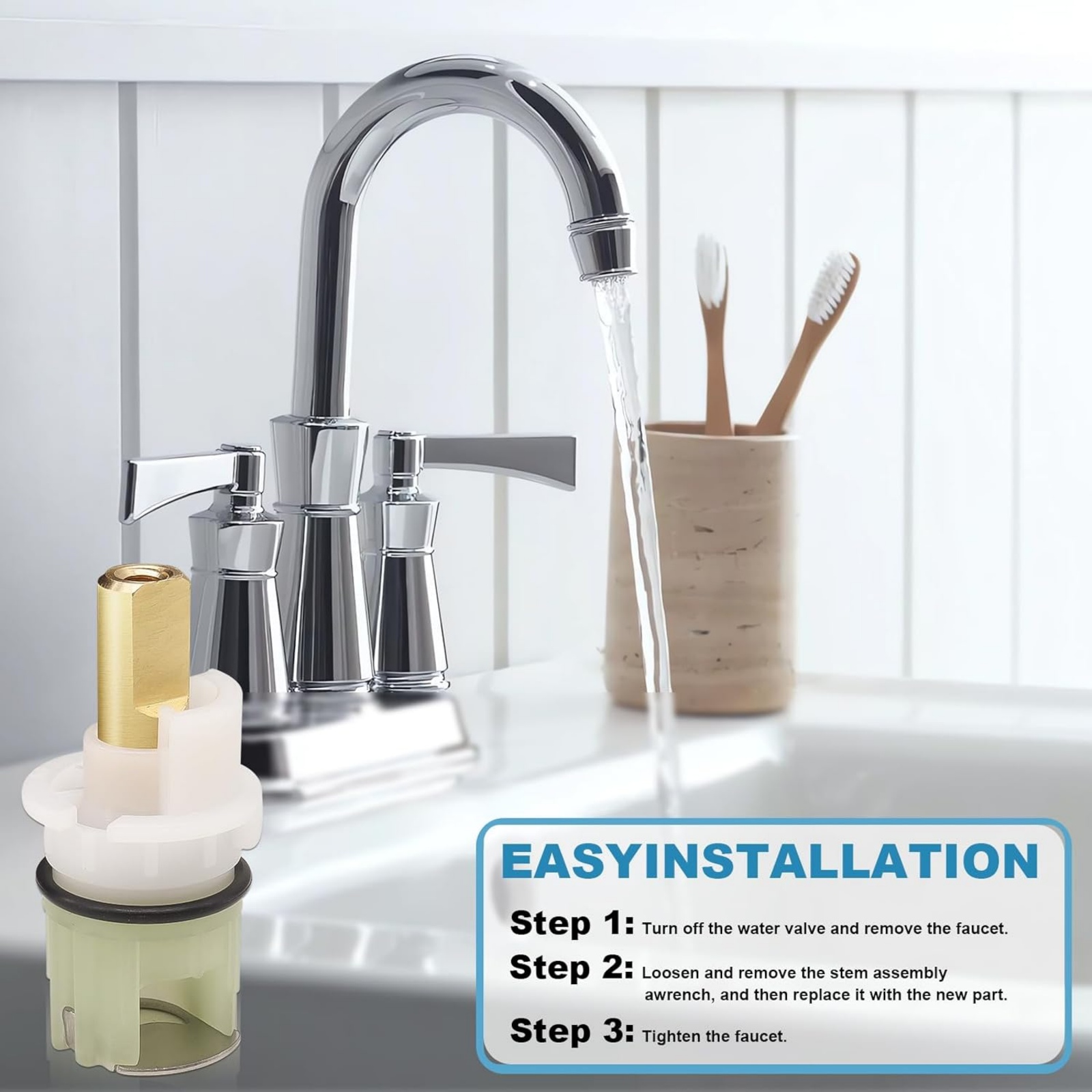 4. Easy Installation: Just Turn Off The Water Valve And Remove The Faucet. Loosen And Remove The Stem Assembly With A Wrench, And Then Replace It With The New Parts, And Finally Tighten The Faucet. Once Everything Is Replaced And Put Back Together Nothing Leak!