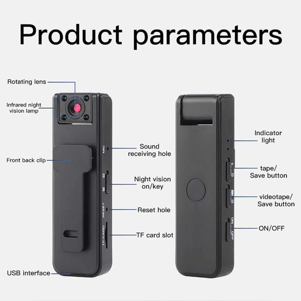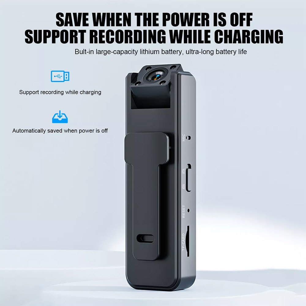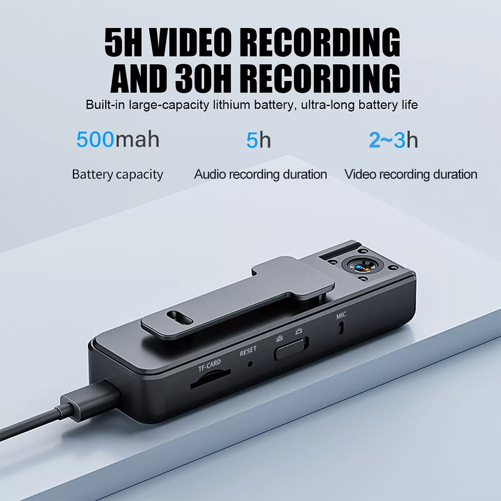 * Built-in high-capacity 500 mAh lithium battery, long battery life, 5 hours of video recording, 30 hours of recording; power outage auto-save, support charging while recording;