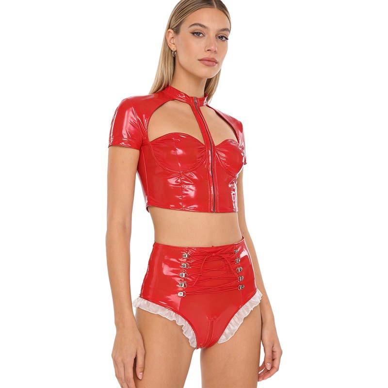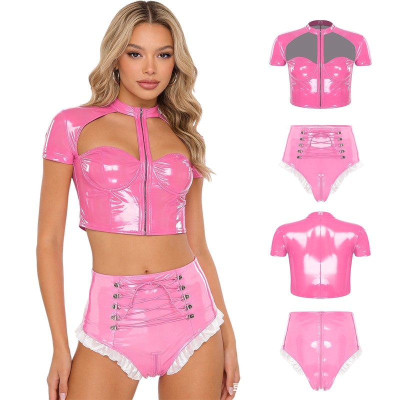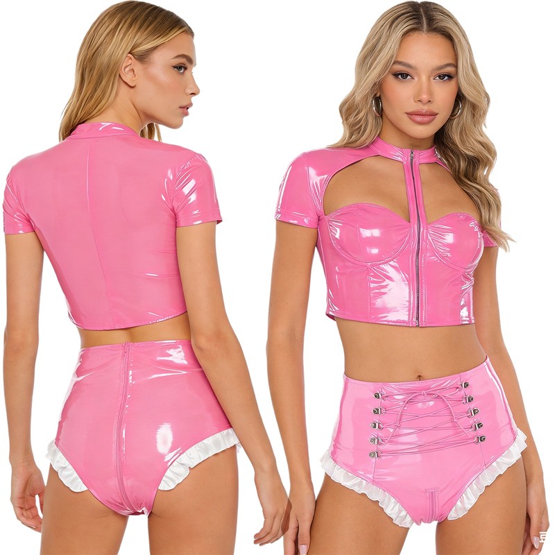 Crafted from a blend of polyester, PU, and spandex, the outfit offers a stretchy and comfortable fit while maintaining a sleek and shiny wet look, a trendy fashion element.