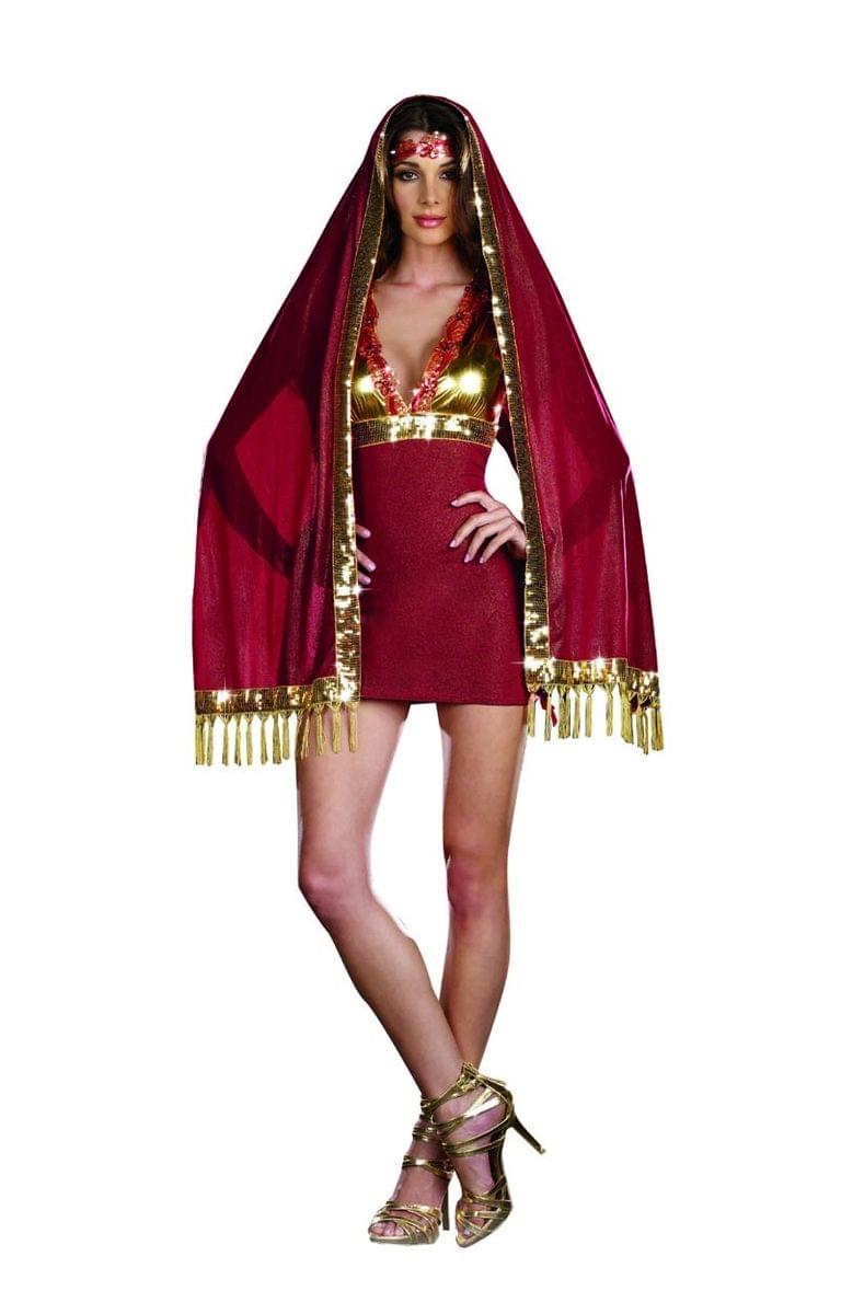 Metallic gold stretch knit bodice with gold sequin and beaded embroidered trim Lower section of dress is deep red with a gold metallic mist foil adjustable at sides Includes Sequin fringed scarf and Embellished headpiece
