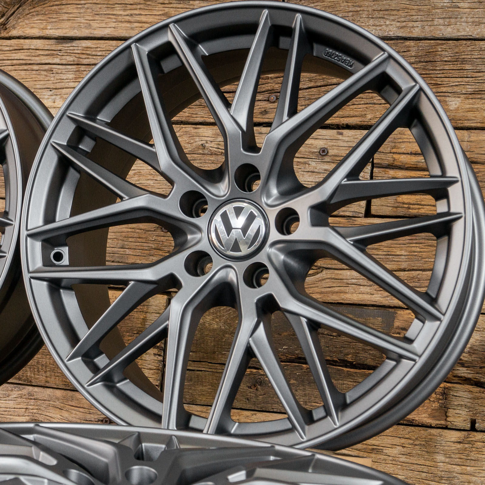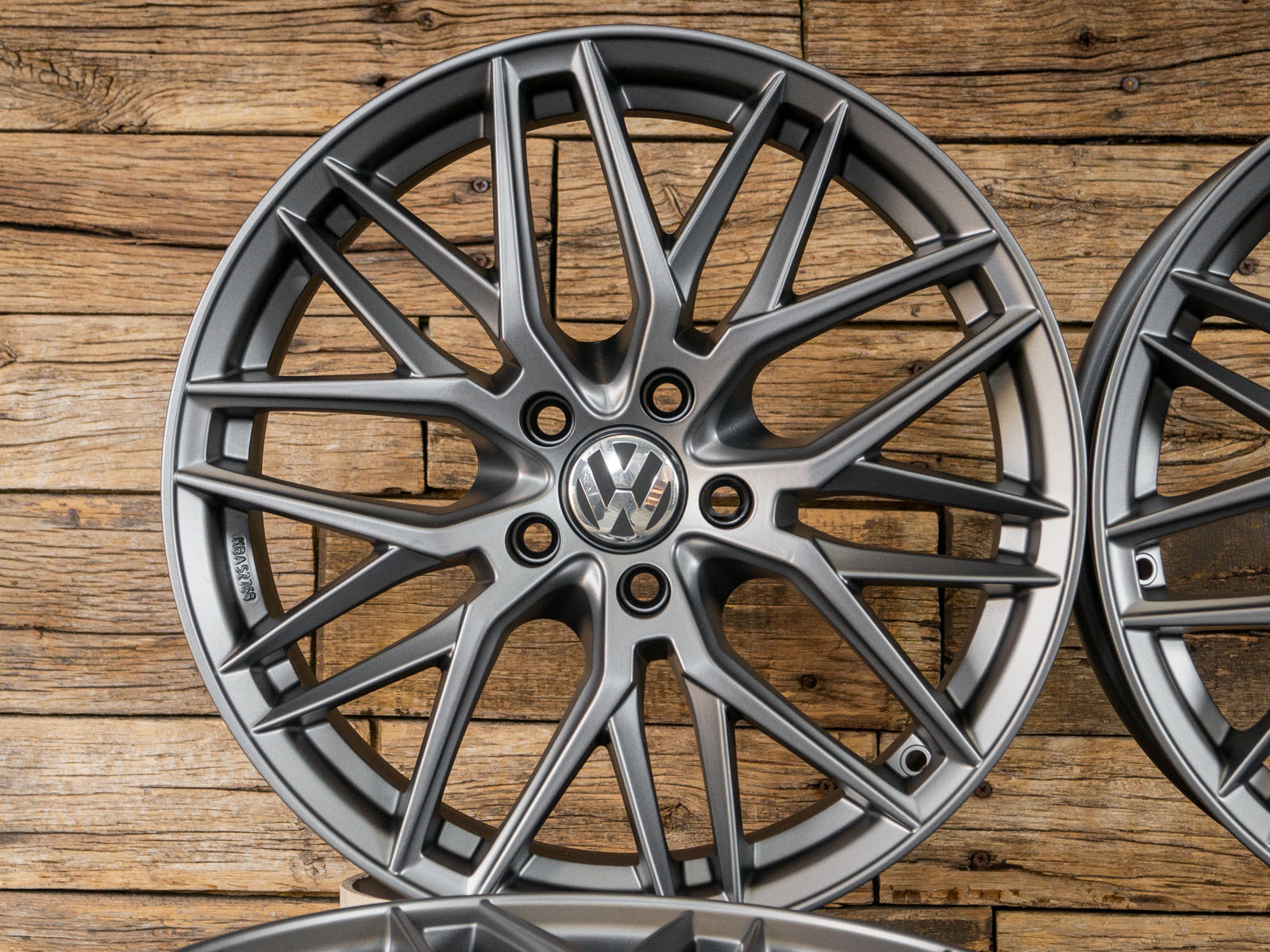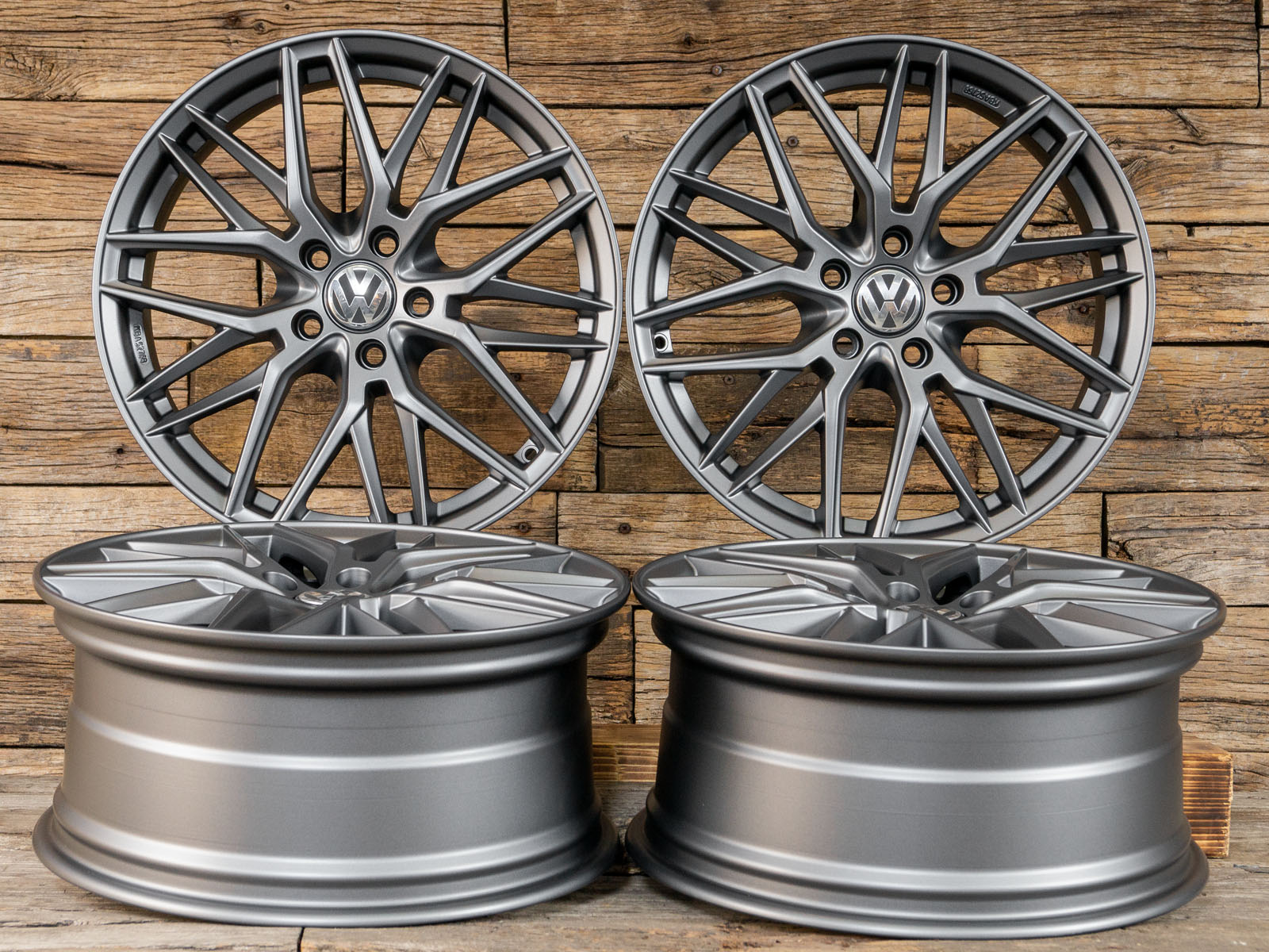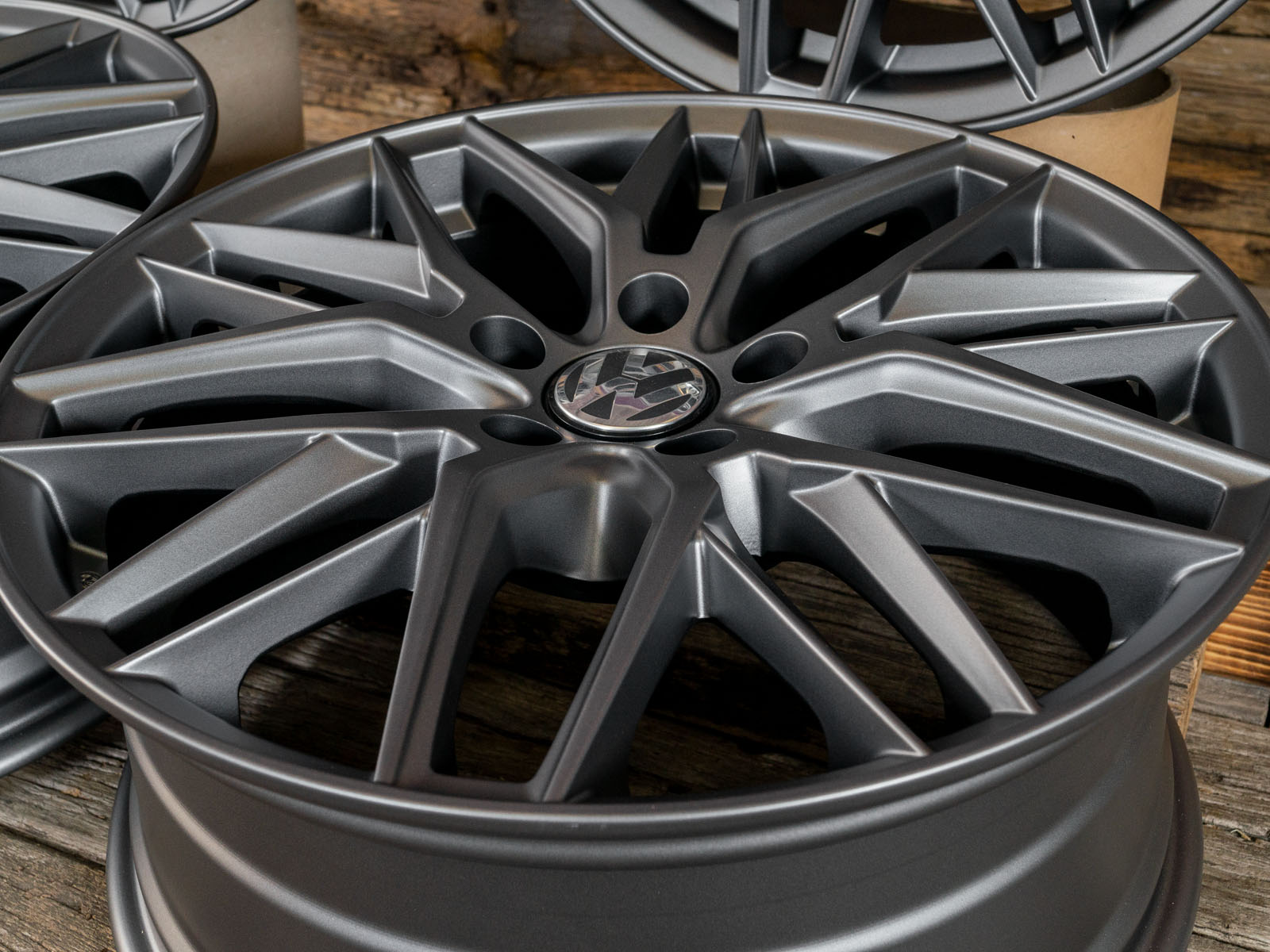 4x neue Alufelgen 18 Zoll ohne Reifen - RW01 8Jx18 ET45 5x112 Grau Matt - 1x ABE - 4x Nabendeckel Raederwerk (VW Deckel nicht enthalten)