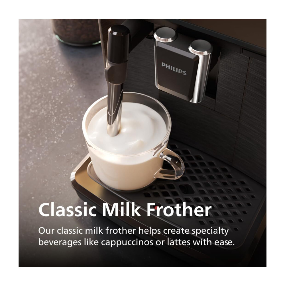 The Philips 1200 Series Fully Automatic Espresso Machine allows you to prepare coffee from fresh beans with a simple process. It combines a built-in grinder, intuitive controls, and a milk frother to help you make espresso, coffee, or milk-based drinks at home. The system is designed to maintain the right brewing temperature and simplify maintenance for daily use.