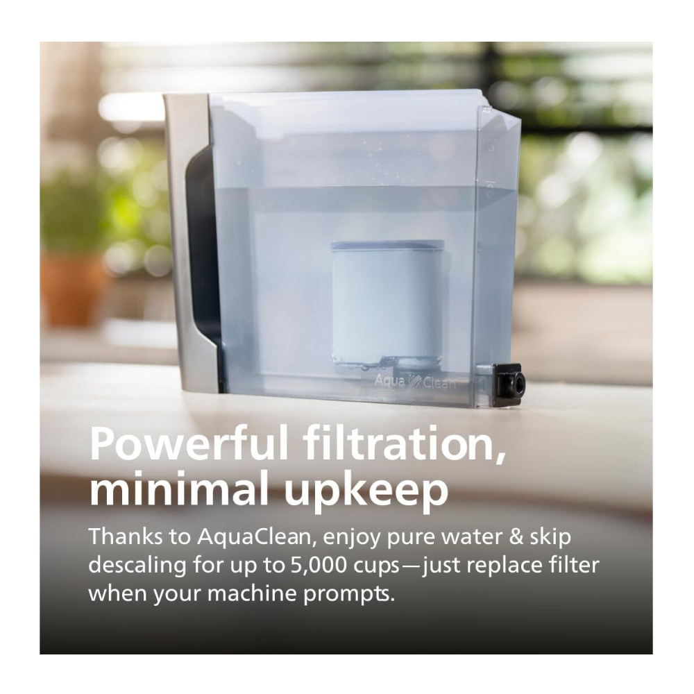 The AquaClean water filter helps provide clear water for brewing. When the filter is replaced as prompted, the machine can make up to 5,000 cups before descaling is required.