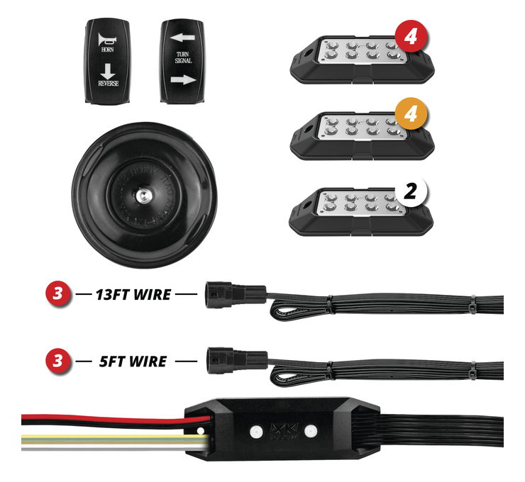 If you're converting a UTV into a road legal machine, then the Plug-And-Play Street Legal Conversion Kits from XK Glow® are an excellent option. The all included, expandable kit provides super-bright amber, red and white light pods for maximum road signal visibility and an extra loud horn to alert other drivers, so you don't go unnoticed.