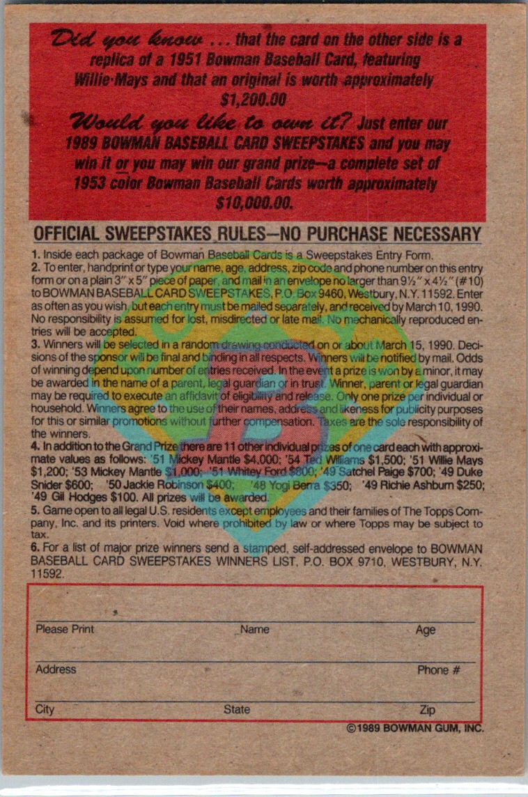 1990 Bowman Reprint Inserts Willie Mays San Francisco Giants #NNO