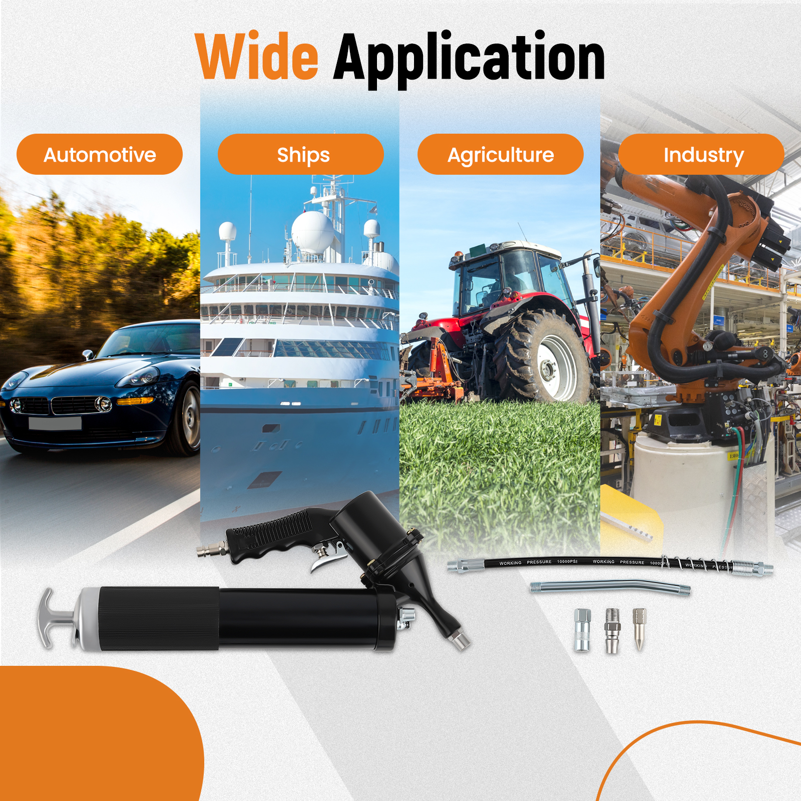 4.Apply in Anywhere: The grease gun kit is easy to operate and can improve lubrication efficiency and service life, as well as save costs. In addition to factories and farms, grease guns can be used in construction sites, fisheries, mines, and other scenarios. It is a wise choice for machinery and equipment lubrication.