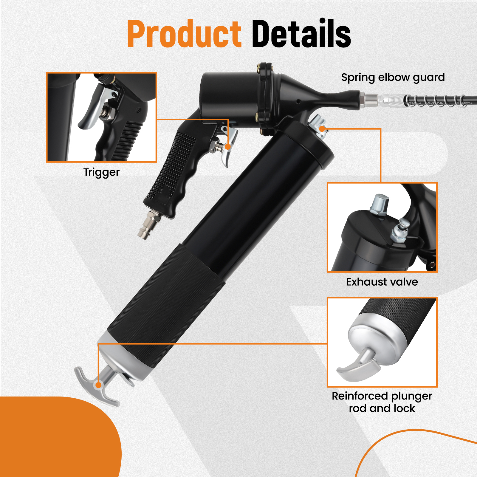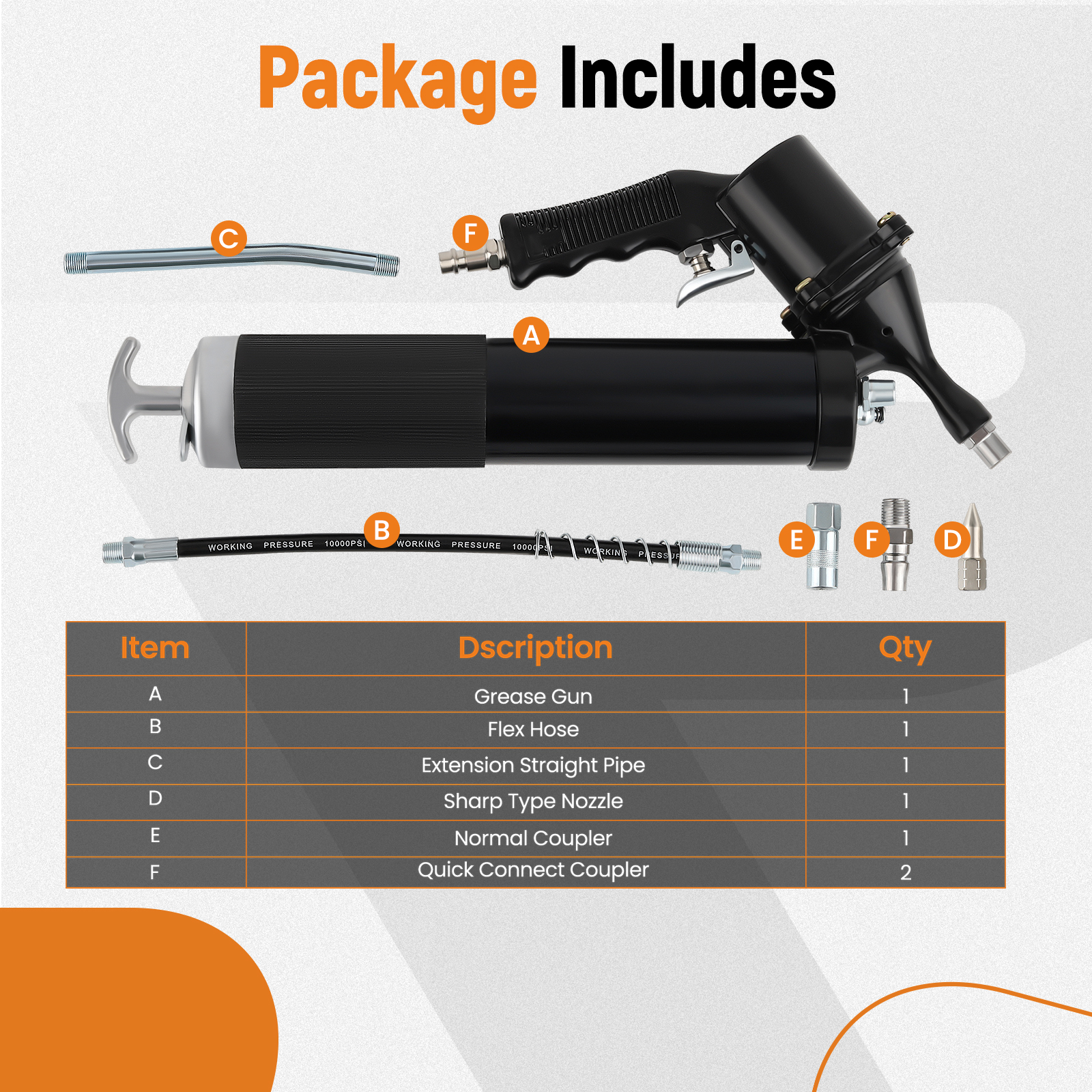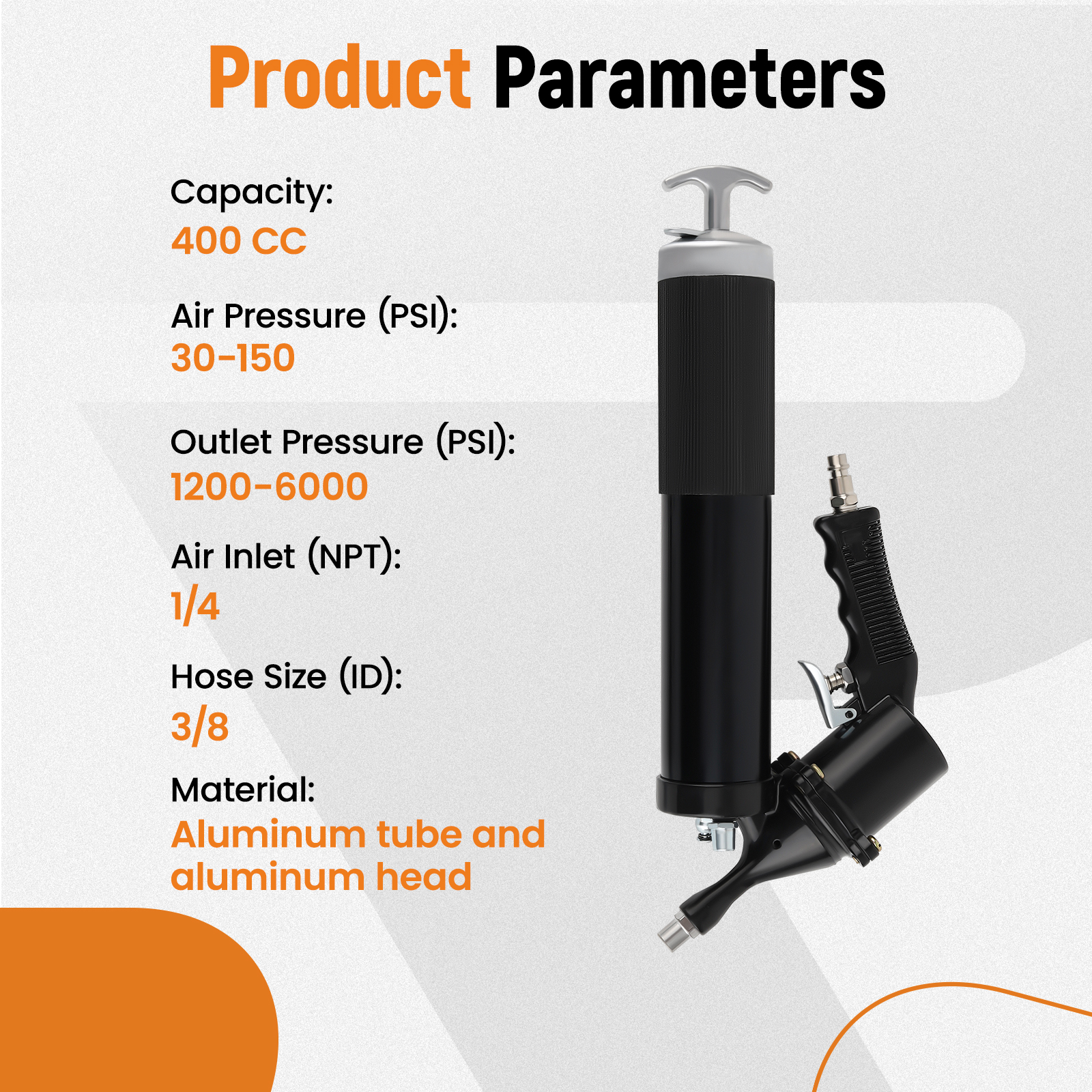 OUTPUT:With pressure in range of 30 PSI to 150 PSI air compressor, the grease gun is capable of delivering 1200 PSI to 6000 PSI