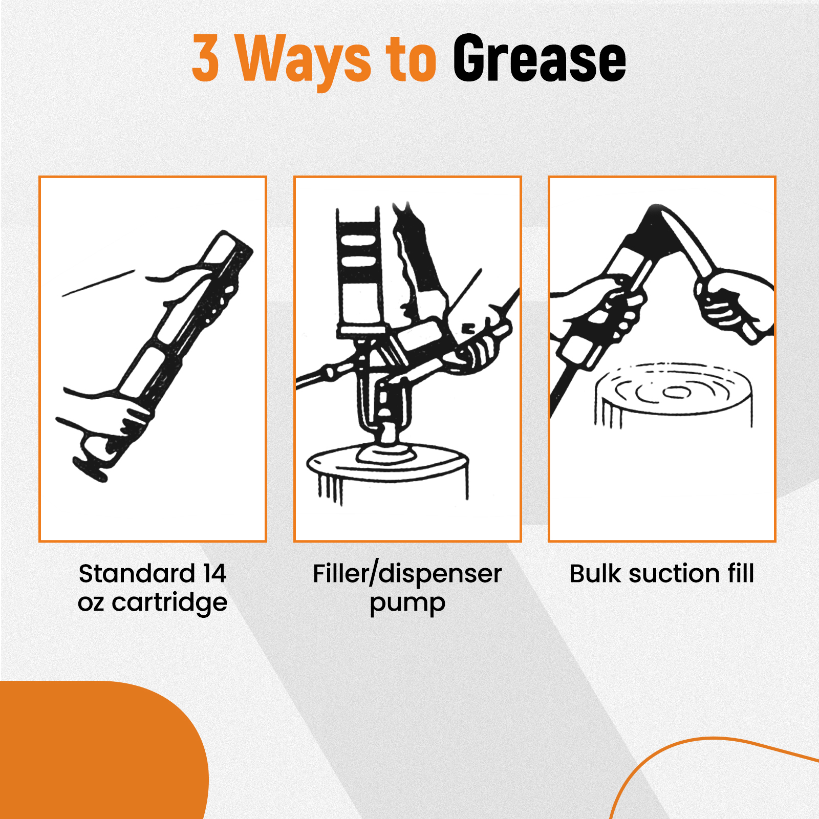 1.3 WAY LOADING: Accepts standard 14 oz. grease cartridges, suction, or bulk filling