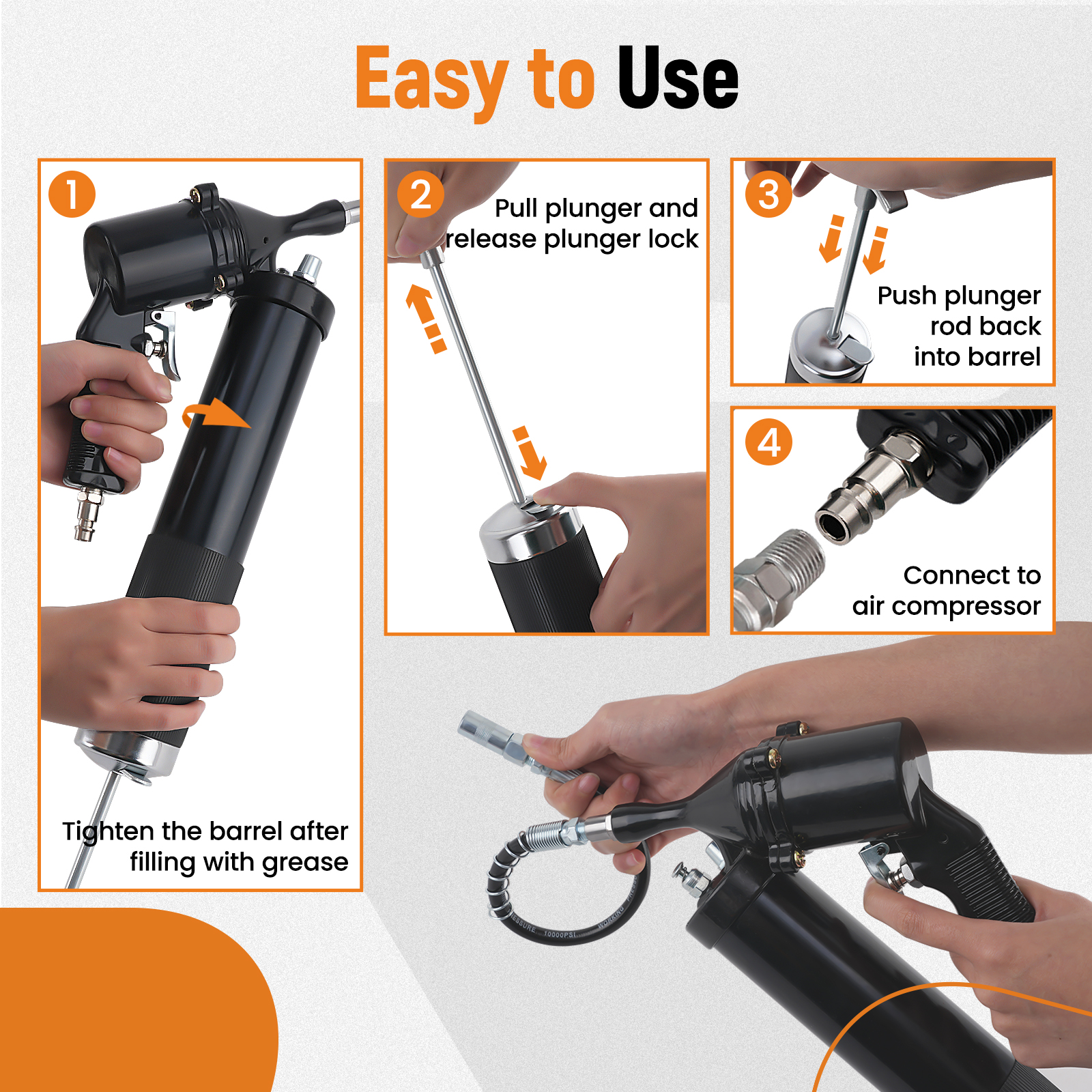 3..6000 PSI Max Working Pressure: Our air operated grease gun allows you to easily handle various high-pressure lubrication tasks without worrying about grease jams. It is suitable for vehicles, tractors, RVs, cars, power output shafts, steering cylinders, universal joints, suspension cross ties, ball joints, lawn mowers, chassis, and drive shafts, etc.