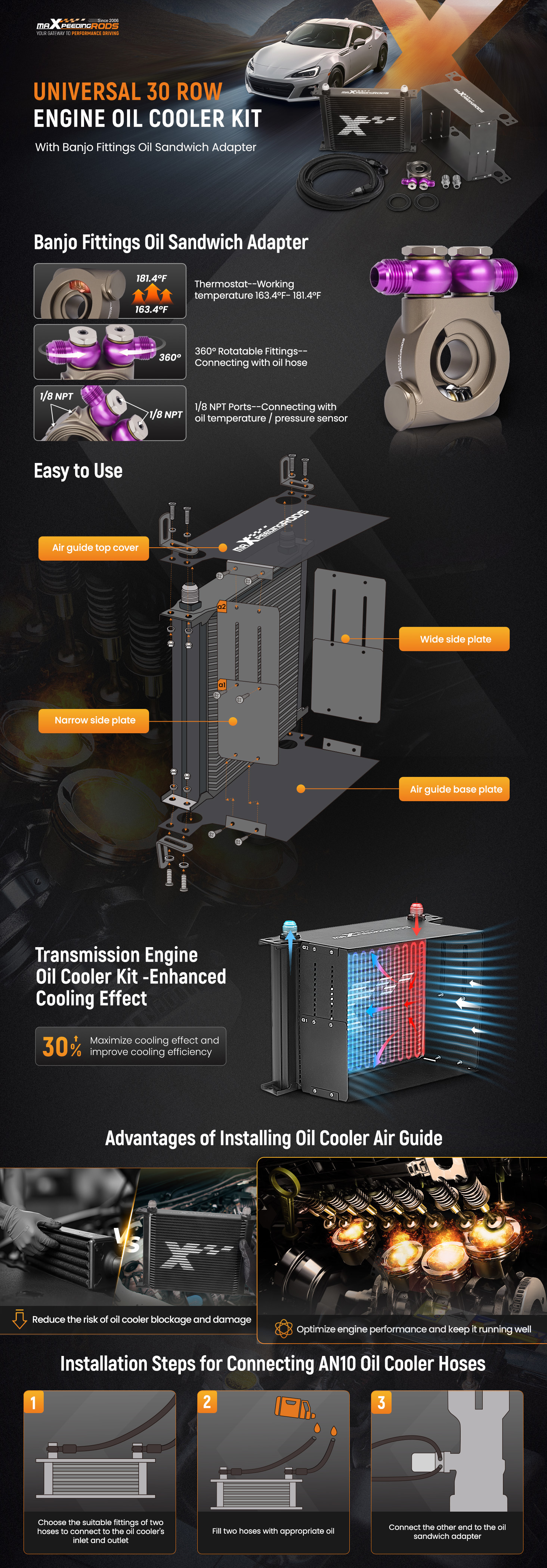 2. This is a universal oil cooler kit. Just measure the size of the space before buying to ensure that it can be installed, and then you can choose the right size according to your cooling efficiency needs.