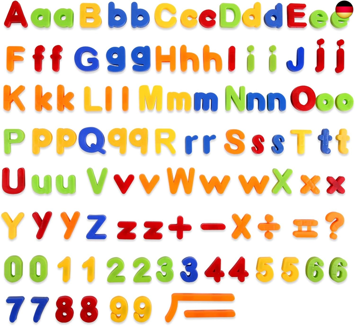 Info zu diesem Artikel- 106 PCS Bunte Magnetbuchstaben Zahlen: Enthält 26 Großbuchstaben, 26 * 2 Kleinbuchstaben, 20 Zahlen +8 Symbole.