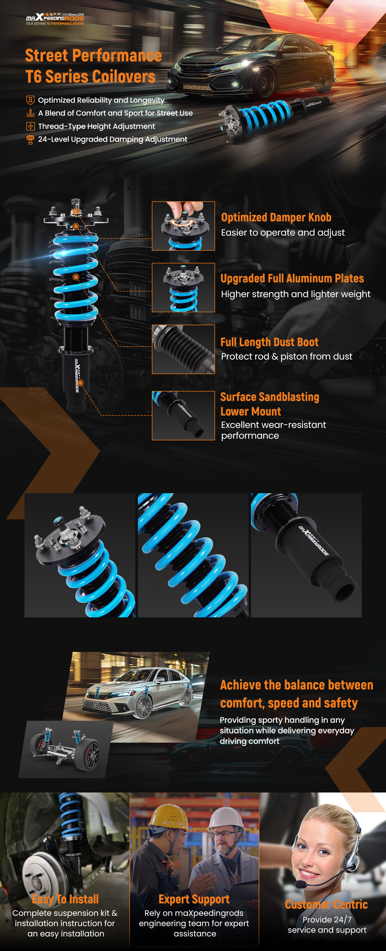 3. 24-fach einstellbare Dämpfung – Ermöglicht die perfekte Abstimmung des Gewindefahrwerks. Für komfortables Fahren die Dämpfung ganz weich einstellen. Für sportliches Fahren auf 16 Klicks einstellen. Für gelegentliche Rennstreckentage ganz hart einstellen.