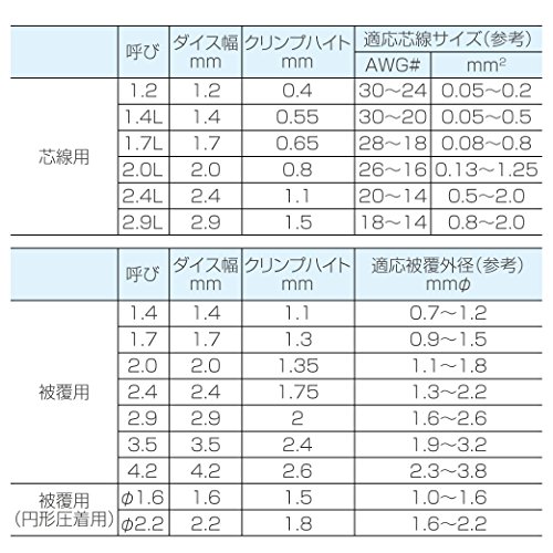 * it is for the crimp of the connection terminals (open barrel). * You can respond to a wide range of terminals by 15 types of large and small dice. * You can more reliably crimp with a light force by the toggle mechanism adopted. * to the crimping of the open barrel. * Length (mm): 230 * Adaptation wire size: AWG # 30 ~ # 14 * Weight (g): 320 * Country: Japan