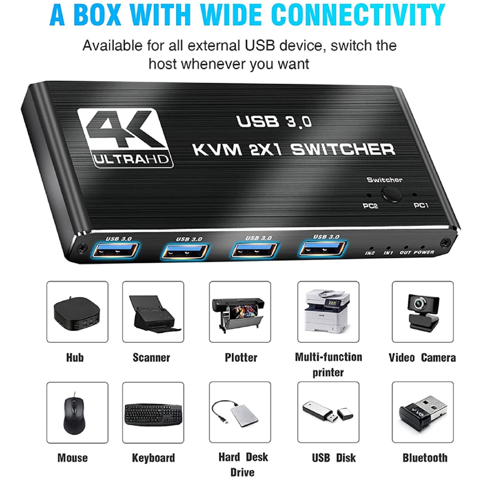 2. USB KVM Switch HDMI: USB and HDMI KVM switch allow a one-click swap between 2 computers to share 4 USB 3.0 peripherals and 1 HD monitor without constantly changing cables or setting up complex shareware. Make your work and life easier and more efficient!