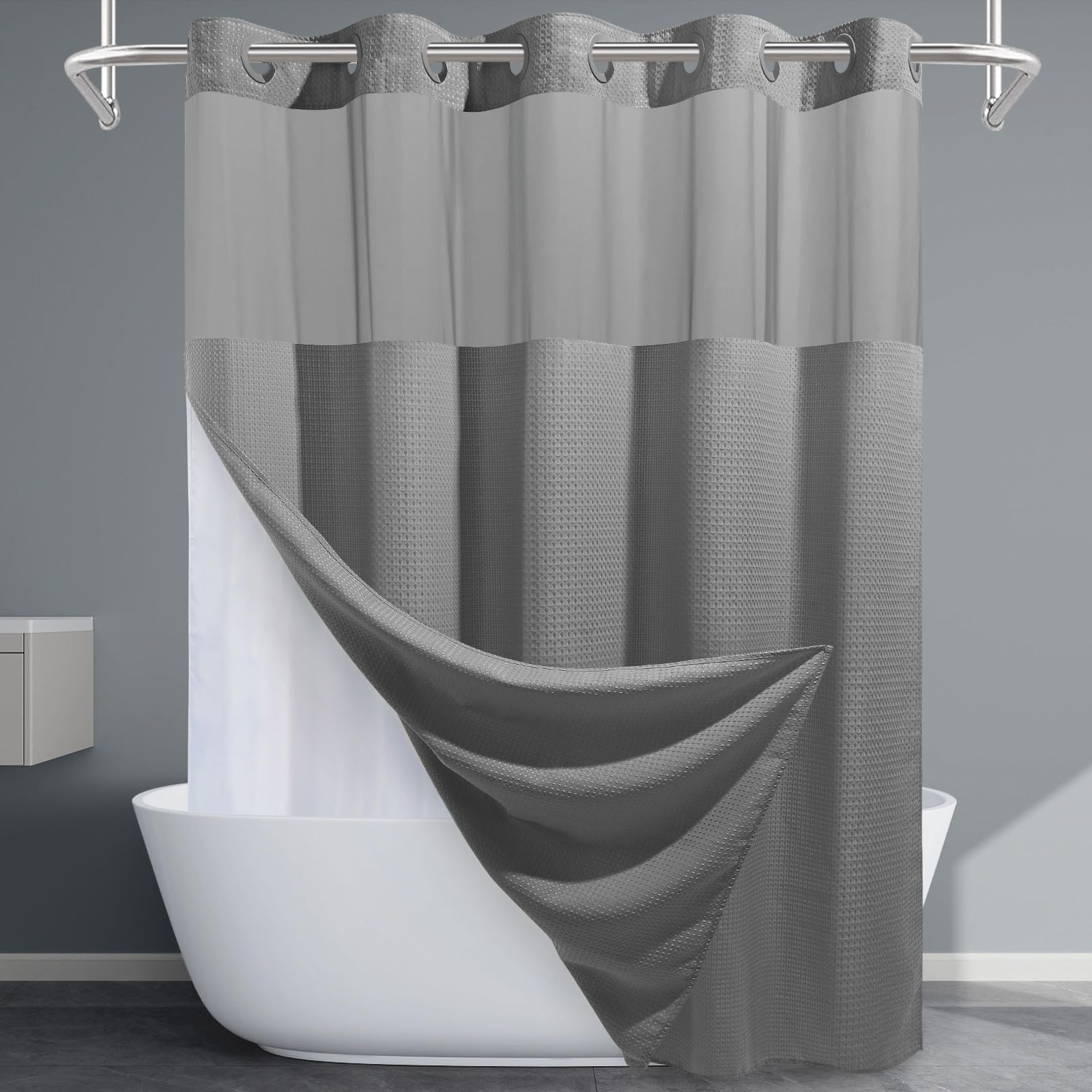 - 【Modern Style】This waffle shower curtain will complement any bathroom - use at home, apartment, condo, hotel, camper, RV, dorm, school shower, college dorm room, athletic club, gym and everywhere else you need a reliable shower curtain. Cloth fabric, machine washable and easy care.Water Resistant: Both shower curtain and liner set are water repellent to let water glide off and quick to dry