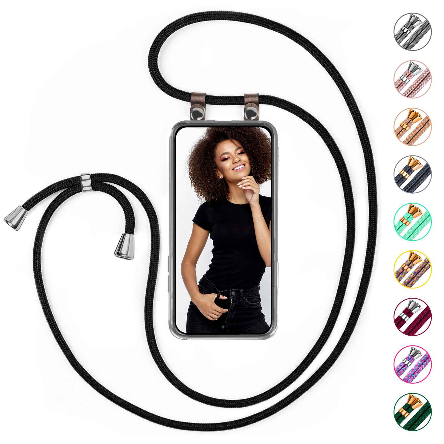 Das Umhängeband ist bis 155 cm frei verstellbar. So kannst du die Umhängehandyhülle schräg über den Körper als Cross-Body Umhängecase oder auch als Handy-Halskette tragen