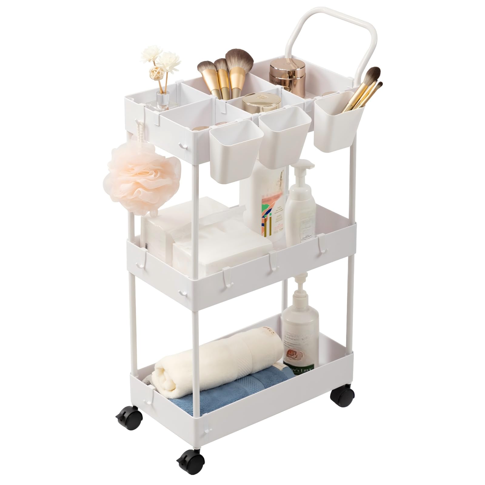 Storage Cart on Wheels, 3 Tier Slim Laundry with Wheels Bathroom Organizer with Hanging Cups Hooks Dividers Handle Mobile Rolling Art Cart for Bathroom Kitchen Narrow Places, White