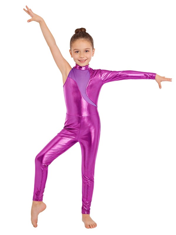 Kids Girls Dancewear Ballet Bodysuit Leotard Jumpsuit Shiny Metallic Catsuit