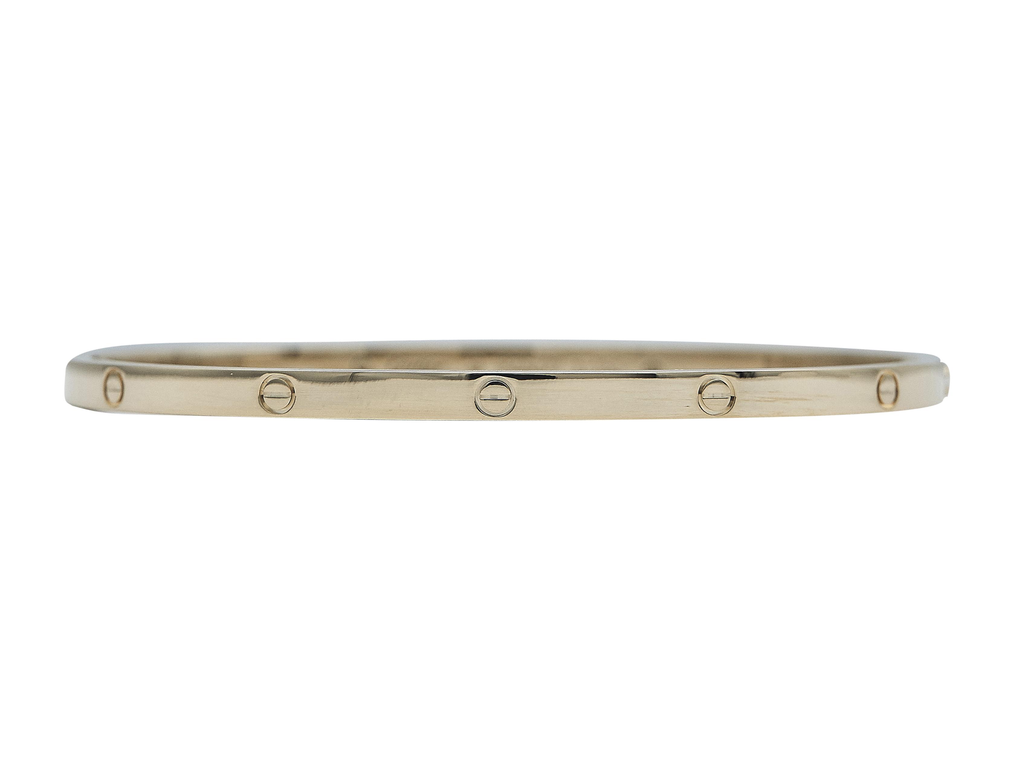 The bracelet: A Cartier Love bangle bracelet designed in eighteen karat yellow gold. This small model is a size 19 and features a single screw closure.