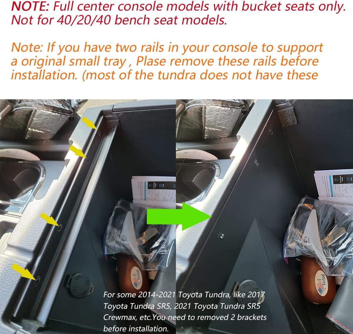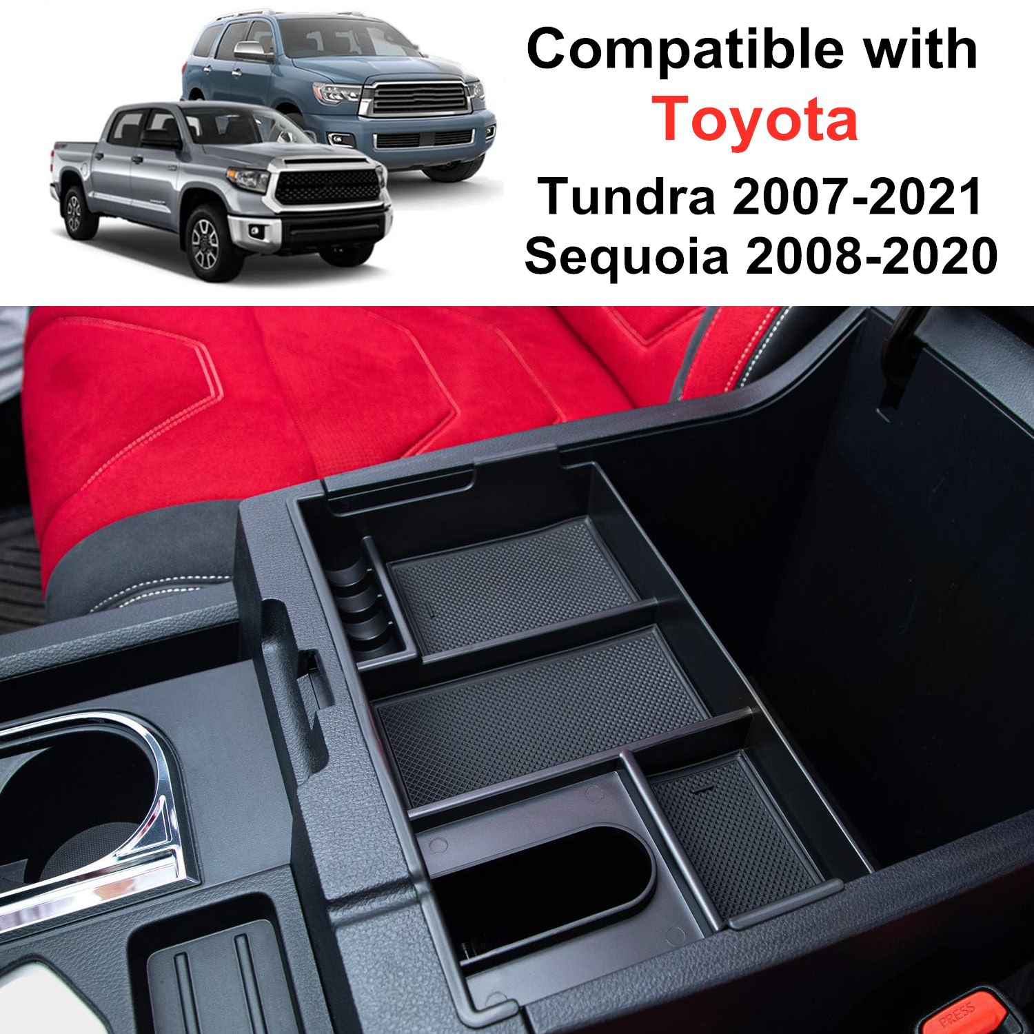 • PATENT DESIGN - The console organizer fits for Toyota Tundra 2007-2021 and Toyota Sequoia 2008-2020. Full center console models with bucket seats only. Not for 40/20/40 bench seat models. Please confirm your car model before purchasing.This matches the internal shape of the center console. And it doesn't interfere with opening/closing the console lid.