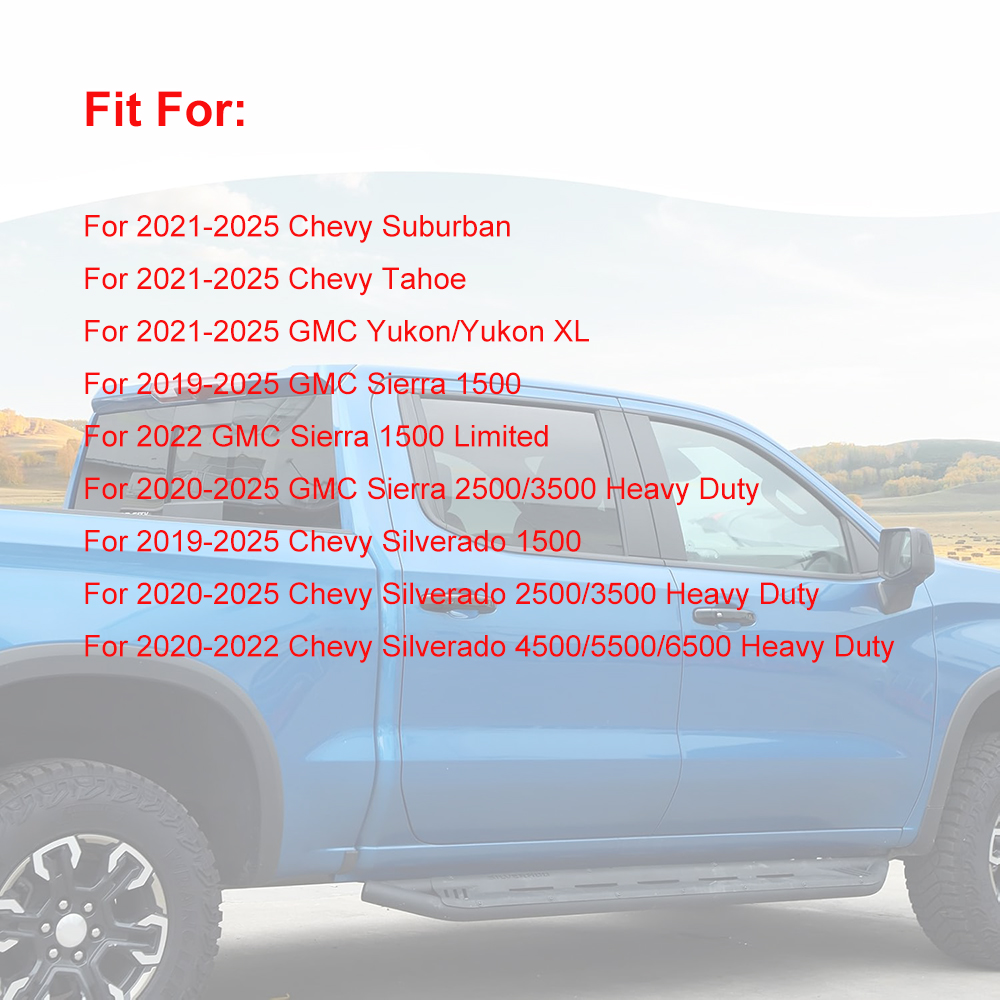 Compatible Models: These exterior door handle covers are fit for the following vehicles: Chevrolet Silverado/GMC Sierra (2019-2025+), GMC Yukon (2021-2025+), Chevrolet Tahoe (2021-2025+) and Chevrolet Suburban (2020-2025+).