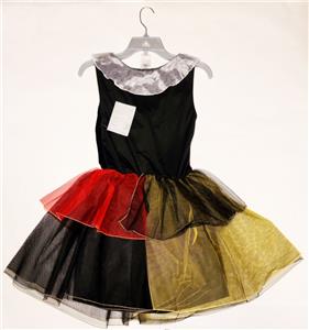 The skirt is made of layers of red, green, and black gauze with gold sparkles on the edges