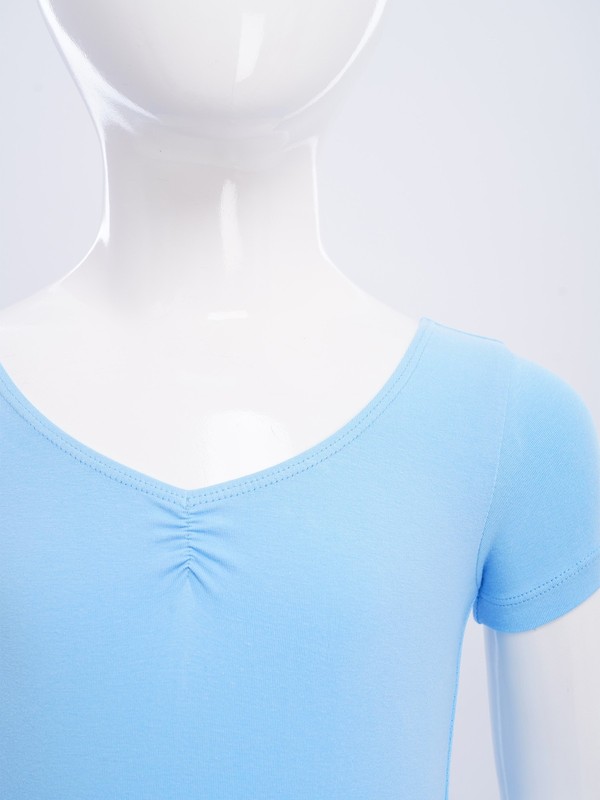 The ruched V-neck short-sleeve leotard adds a flattering and stylish touch, highlighting the latest fashion trends in dancewear and giving a trendy look.