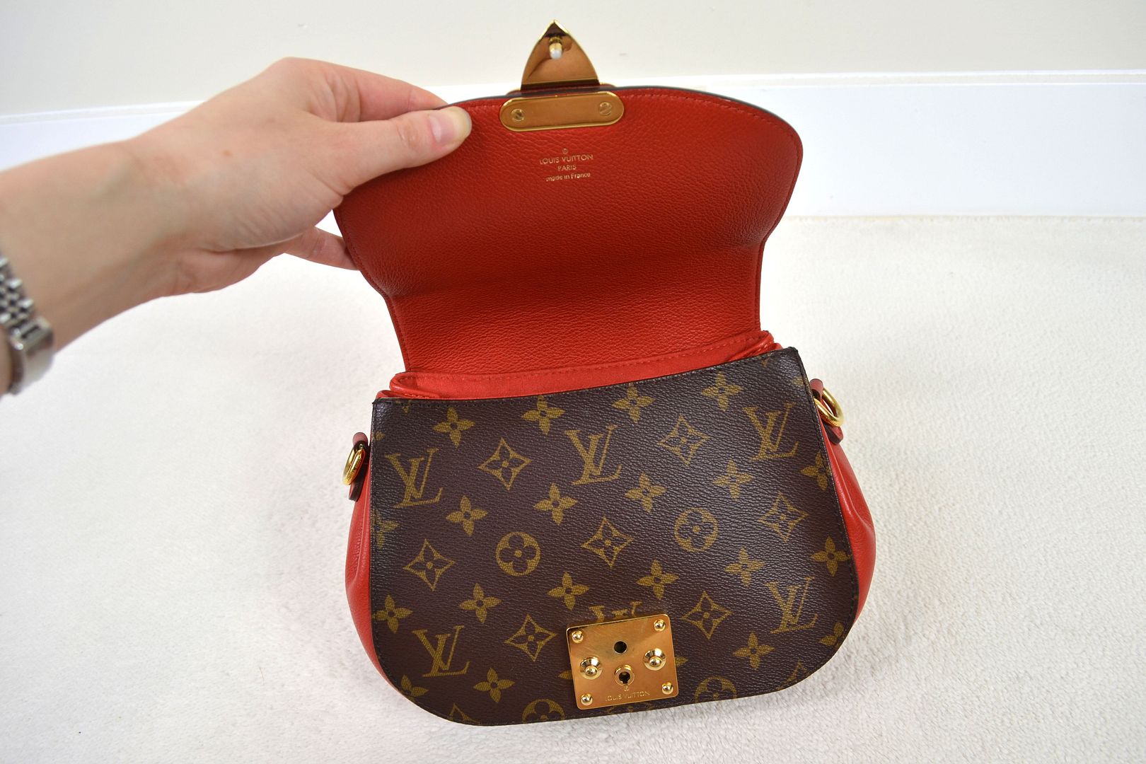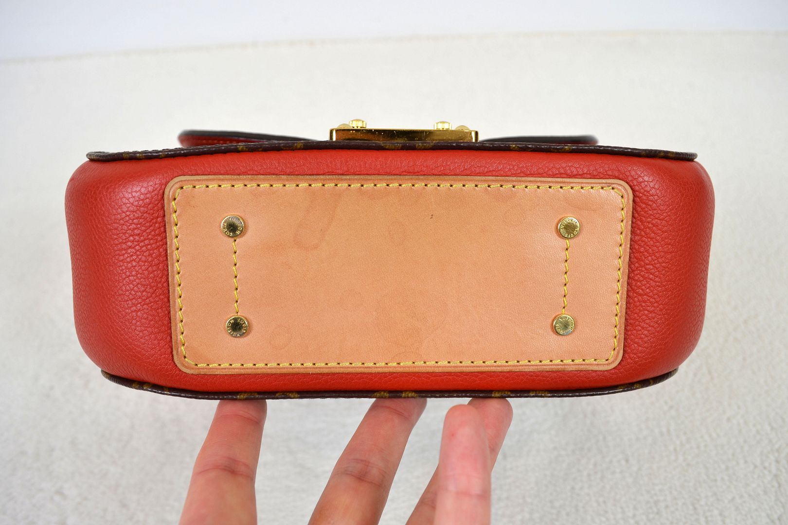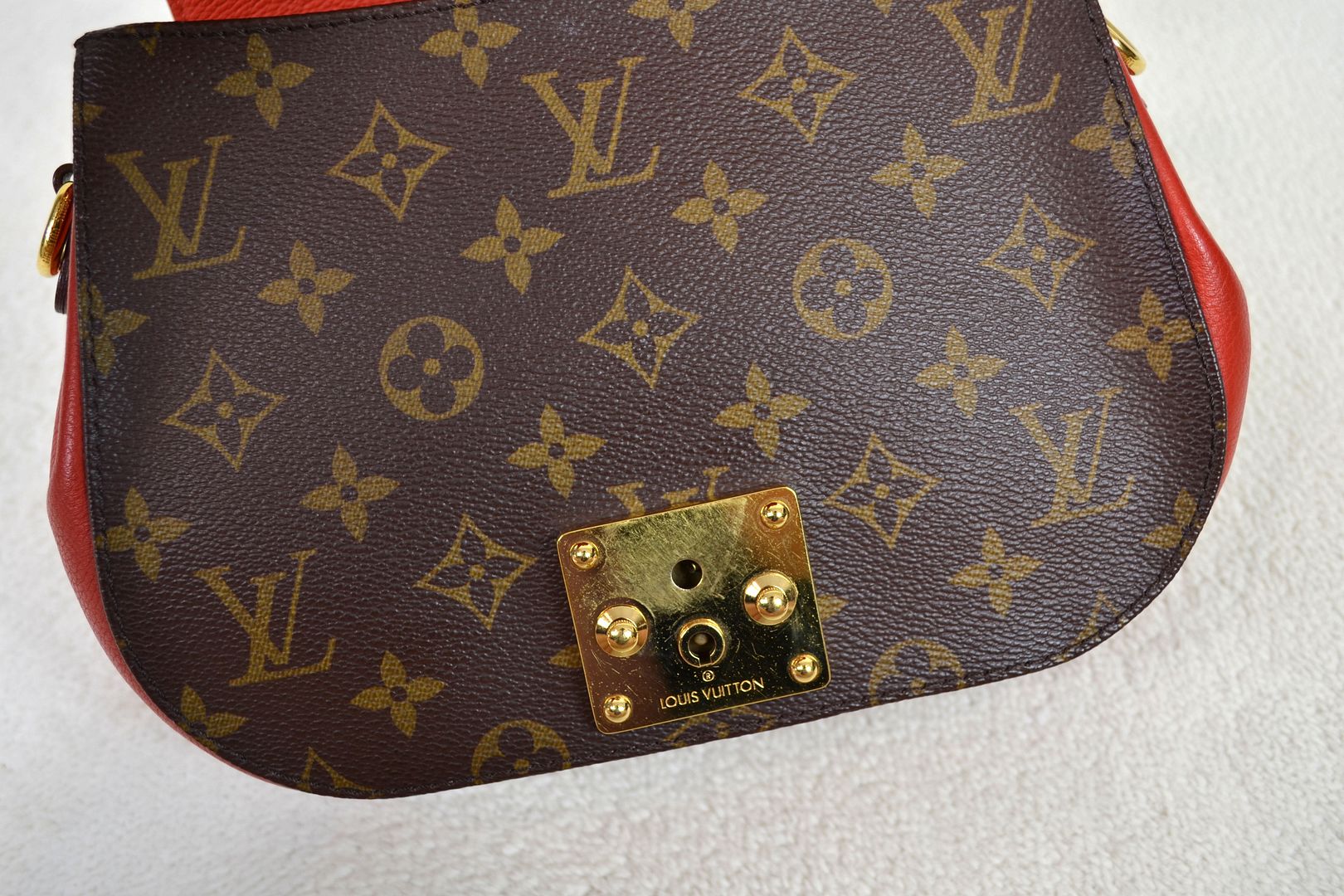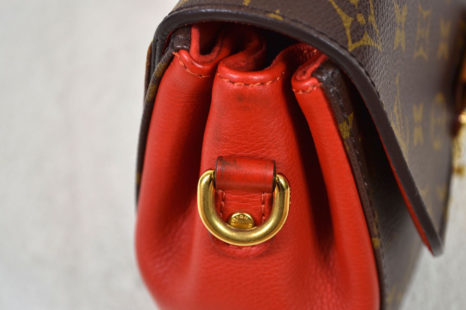 THIS HANDBAG WILL COME WITH THE LV KEYS! AUTHENTICITY: This bag will be authenticated by eBay's authentication program as known as "Authenticity Guarantee". As soon as it is purchased, it will first be shipped to eBay's authentication center for a multi-point inspection. eBay's authenticators verify dozens of inspection points, including packaging, handbag details, smells, authenticity, description accuracy, and accessories. Once verified as authentic, it will be shipped to you. eBay will provide an authenticity card and a high-quality eBay dust bag specifically designed for this brand! (Unconfirmed USA addresses & US Territory buyers do not qualify for eBay authentication!) ITEM CONDITION: This Louis Vuitton bag is in VERY GOOD CONDITION! The monogram canvas exterior is in overall great condition with signs of light rubbing wear on the bottom corners and tiny marks throughout. The red leather bottom and sides have signs of dark marks, dirt wear, and a rubbed spot. The vachetta leather bottom panel has signs of rubbing, scratches, dirt wear, and water spots. The gold tone hardware has signs of scratches, scuffing wear, spots, marks, and tarnishing in areas. The leather top handle and back leather panel have signs of scratches, scuffing, marks, dirt wear, abrasions, water marks, and the leather top handle features a repainting job with vachetta leather paint. The canvas strap has signs of wrinkling, marks where the buckle has sat, indention marks, edge rubbing, and light wear on the hardware. The interior is in great condition with light signs of dirt wear and lint inside. The underside of the flap is in great condition with minimal signs of wear. The bag smells nice and clean!____________________________________________________________________________