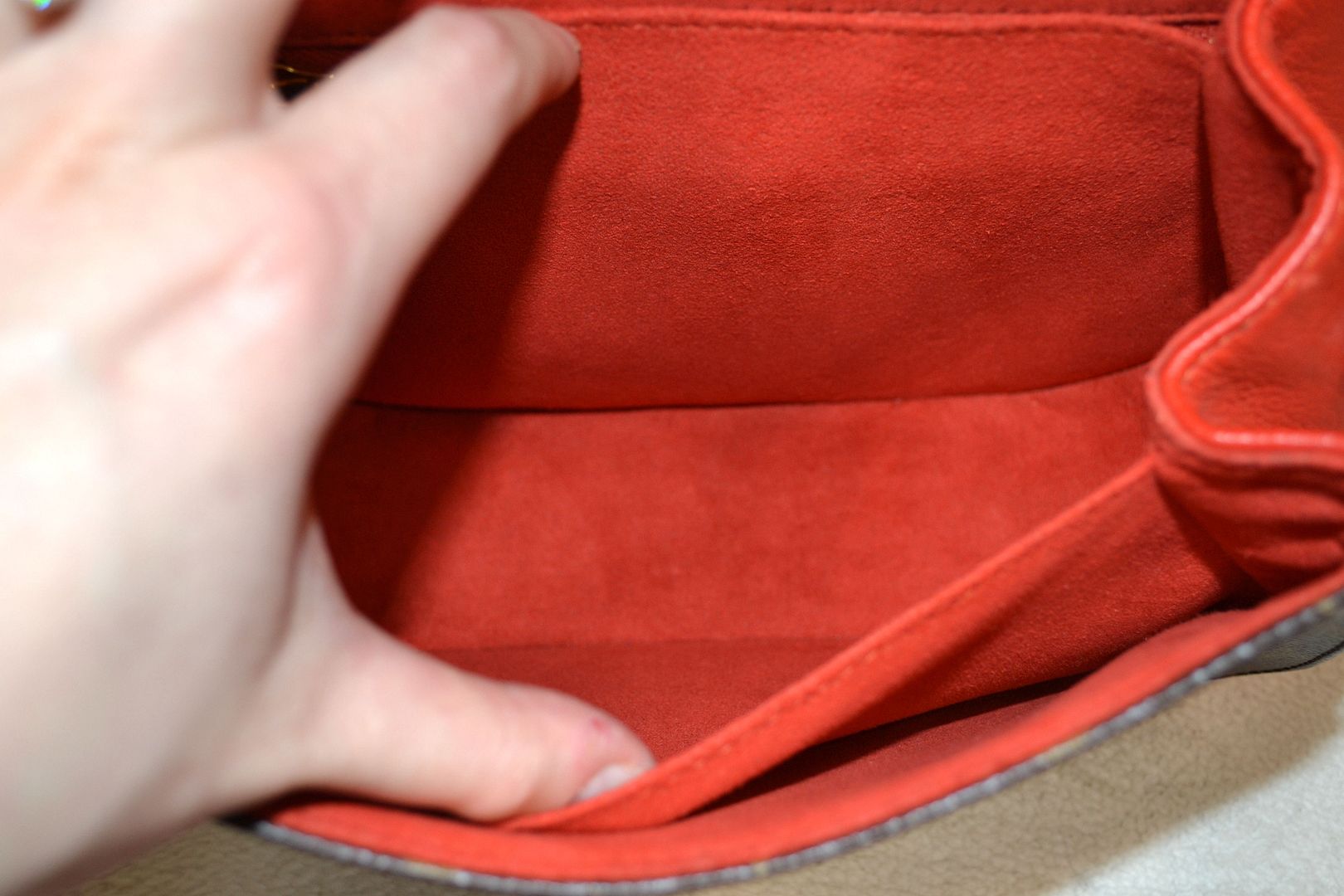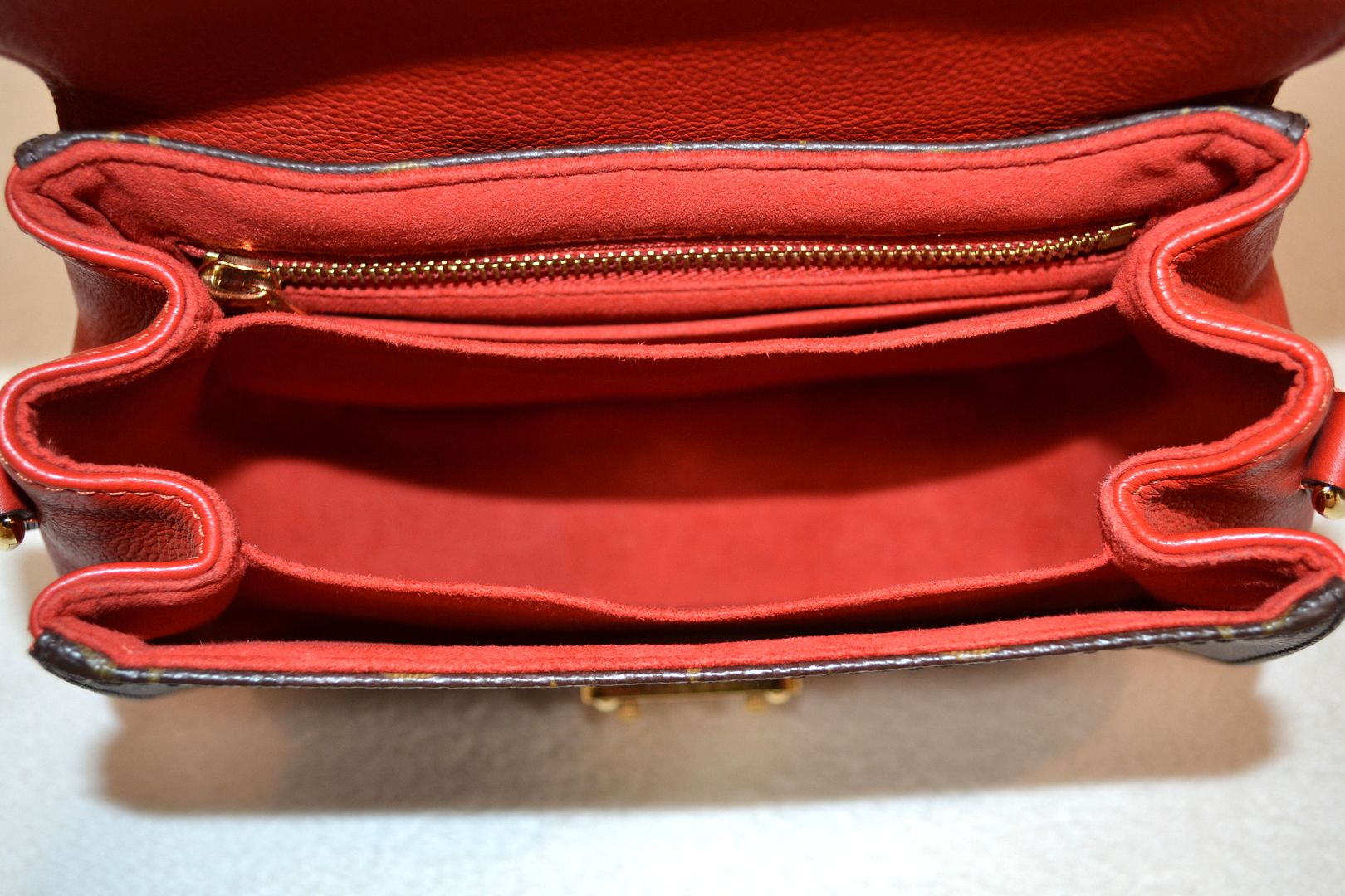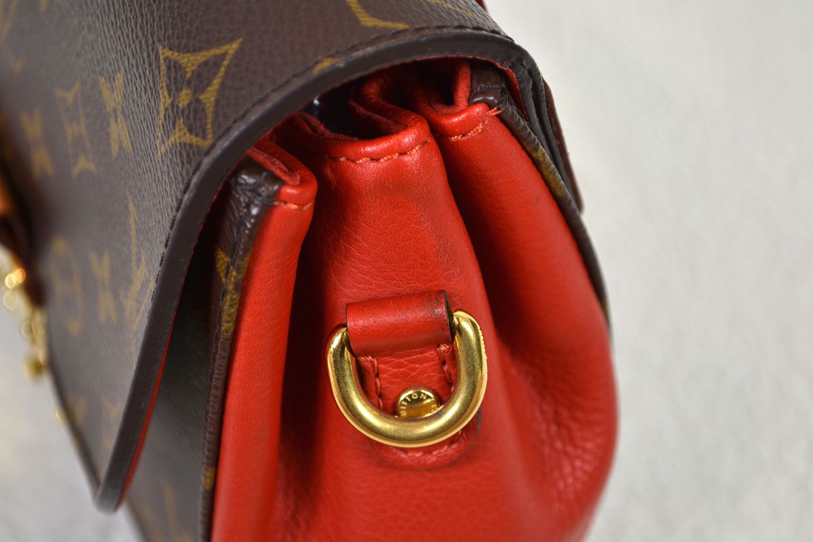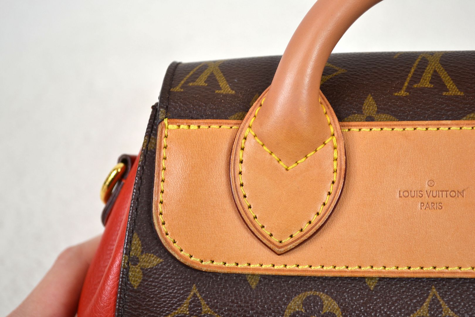 Length Across: 9.75 inches at the widest, 7.25 inches at the top Height: 6.5 inches Depth: 3 inches Strap Drop: Handle (1.5 inches), Strap (10 - 12 inches) Monogram canvas body with vachetta leather and red leather trims, Gold tone hardware, Leather top handle, Detachable adjustable shoulder strap, Leather and gold tone feet on the bottom, Louis Vuitton signature on the backside, Top handle satchel shoulder style bag with flap lock closure, Microfiber interior lining, Multiple interior pockets and 1 zip pocket, Louis Vuitton signature on the underside of the flap. The date code is located on the inside edge of the interior zip pocket. Date Code: AR0143