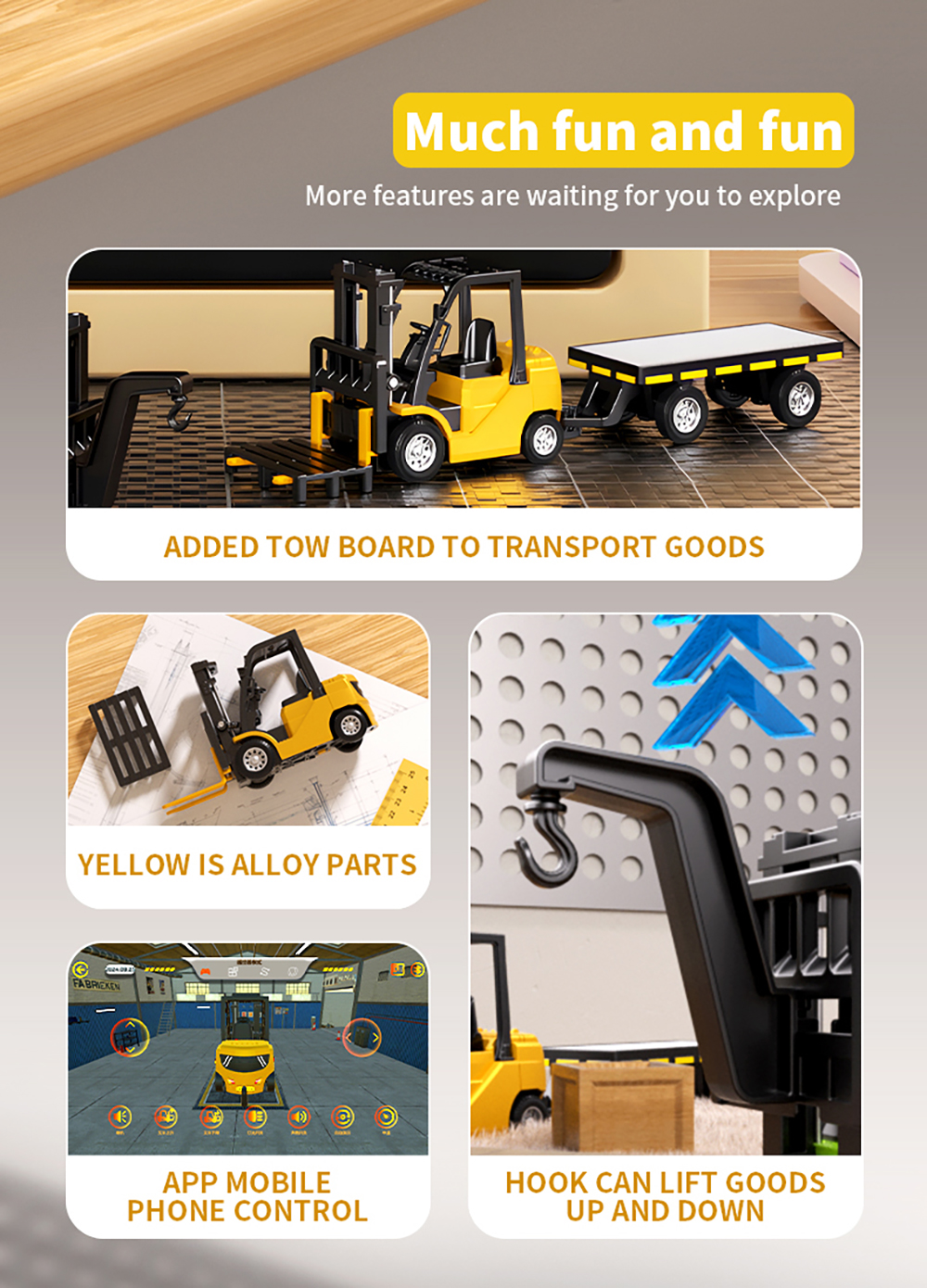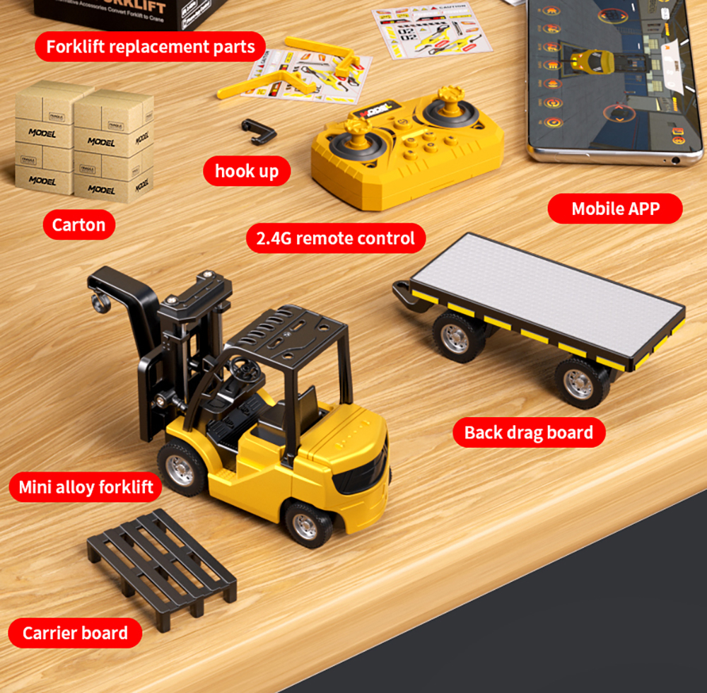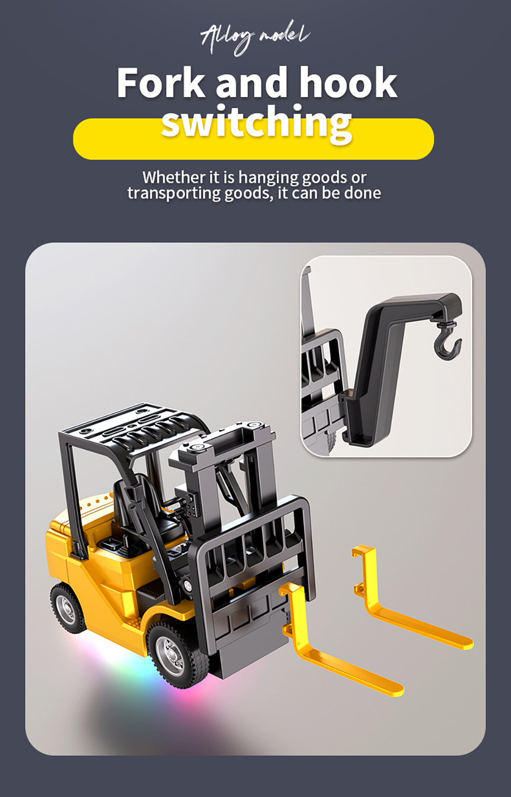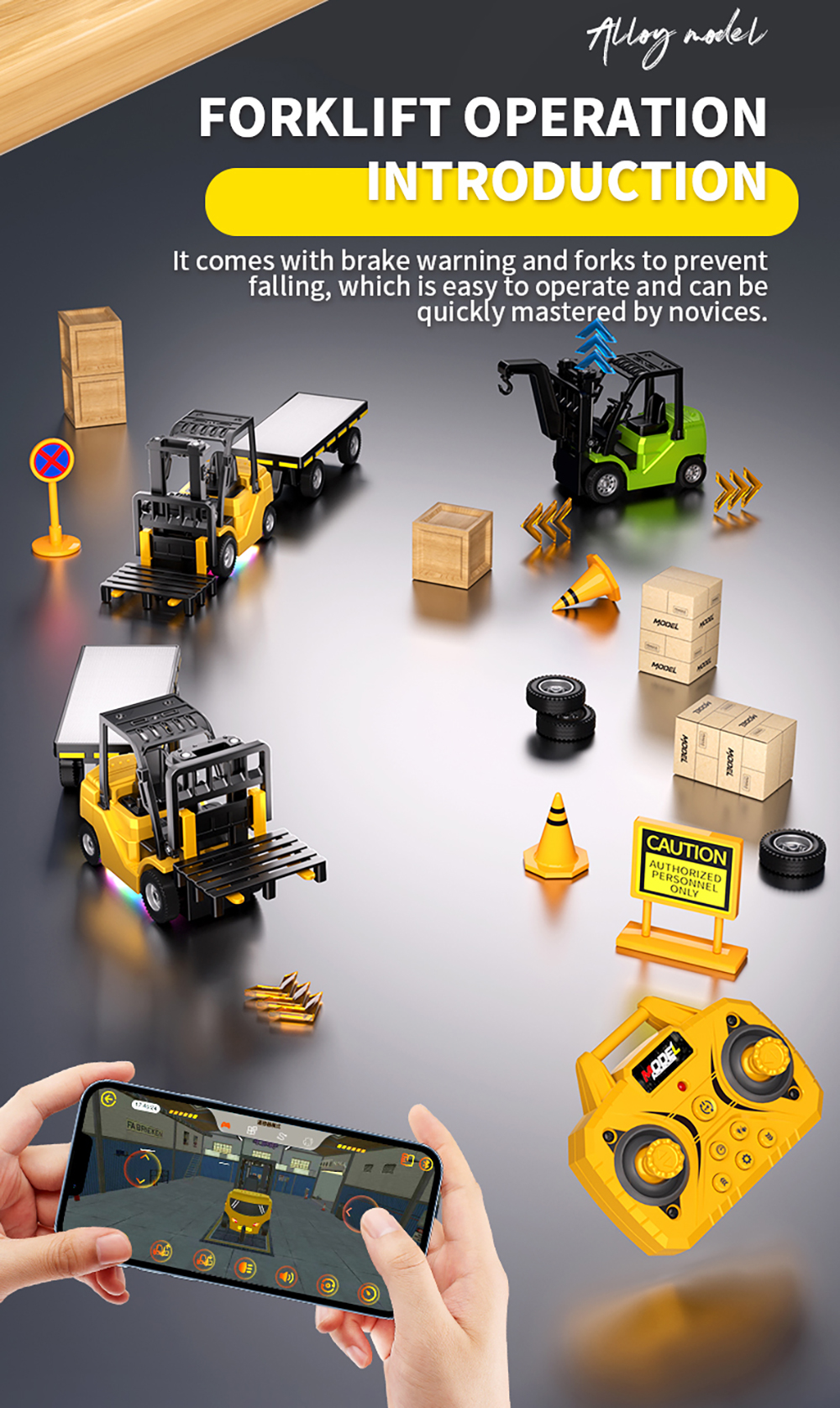 Mini simulation model, alloy body and fork, with lighting and sound effects; Equipped with forward and backward, left and right turn, lighting, music, horn, up and down, speed adjustment, and automatic demonstration functions; Support mobile app connection, made of alloy material, easy to replace accessories.