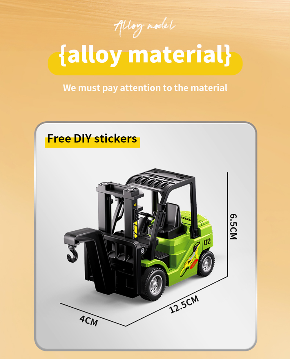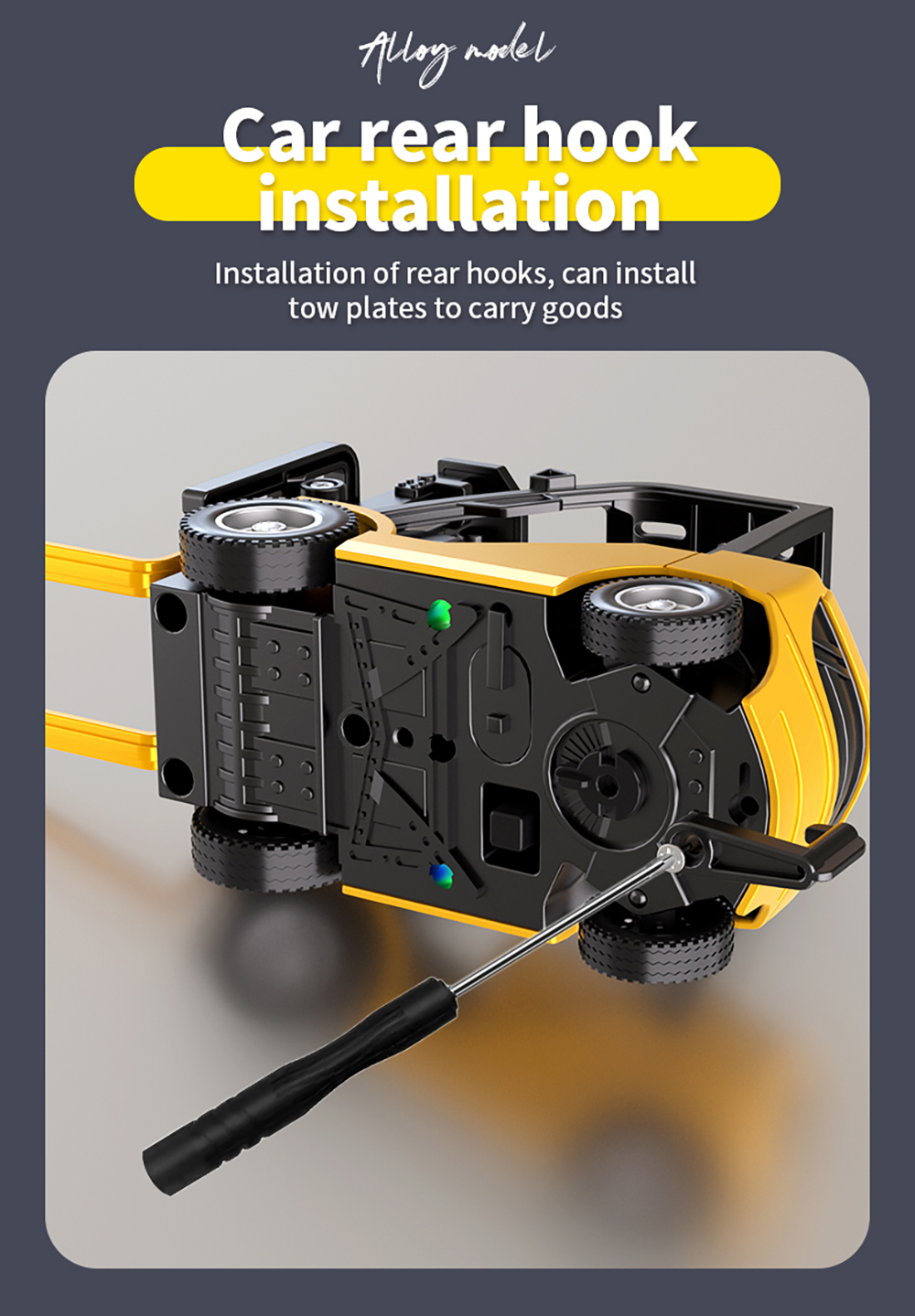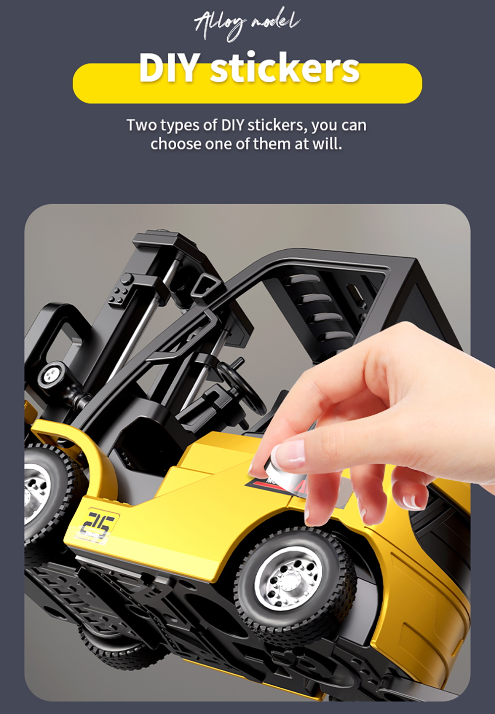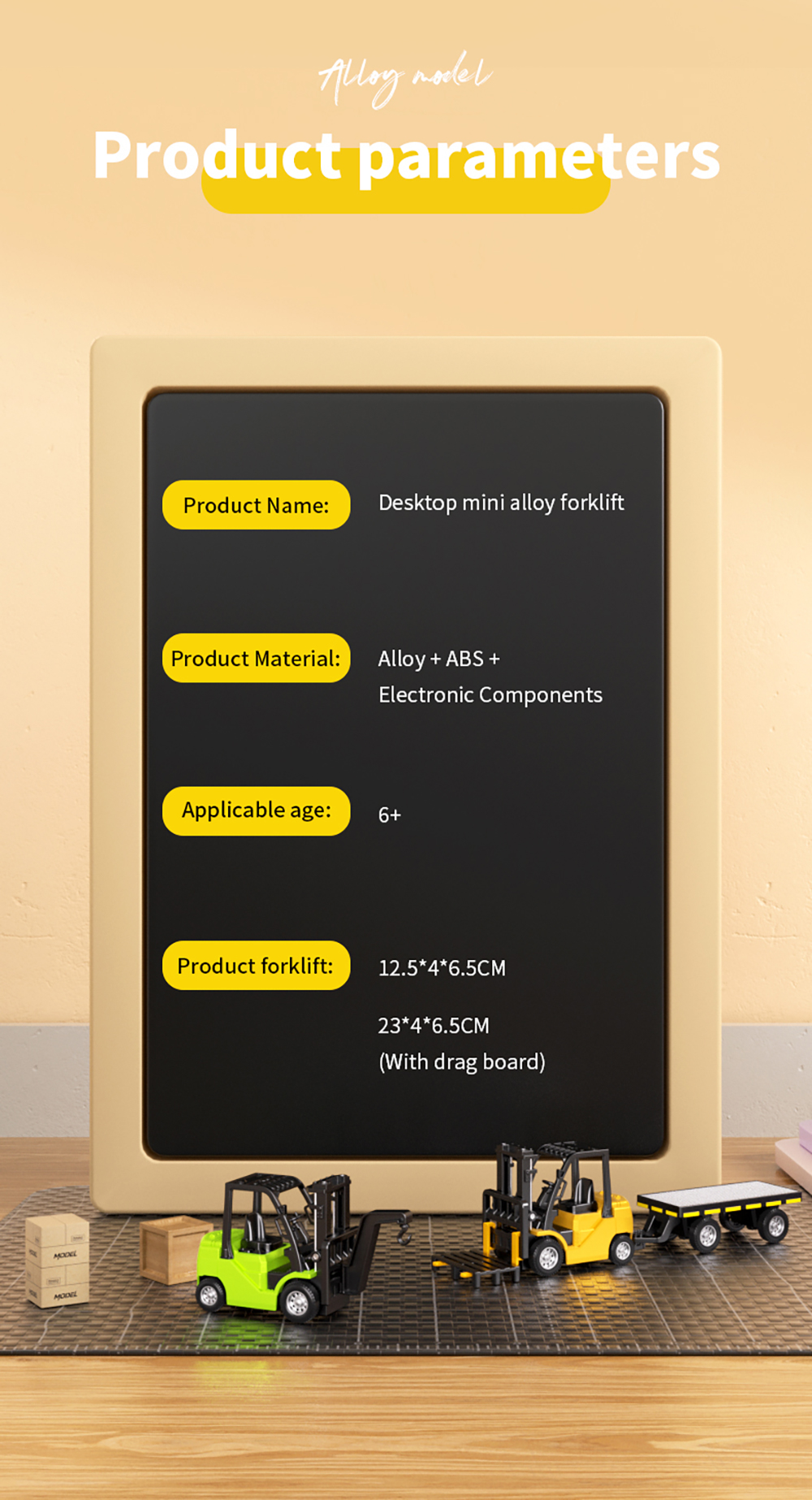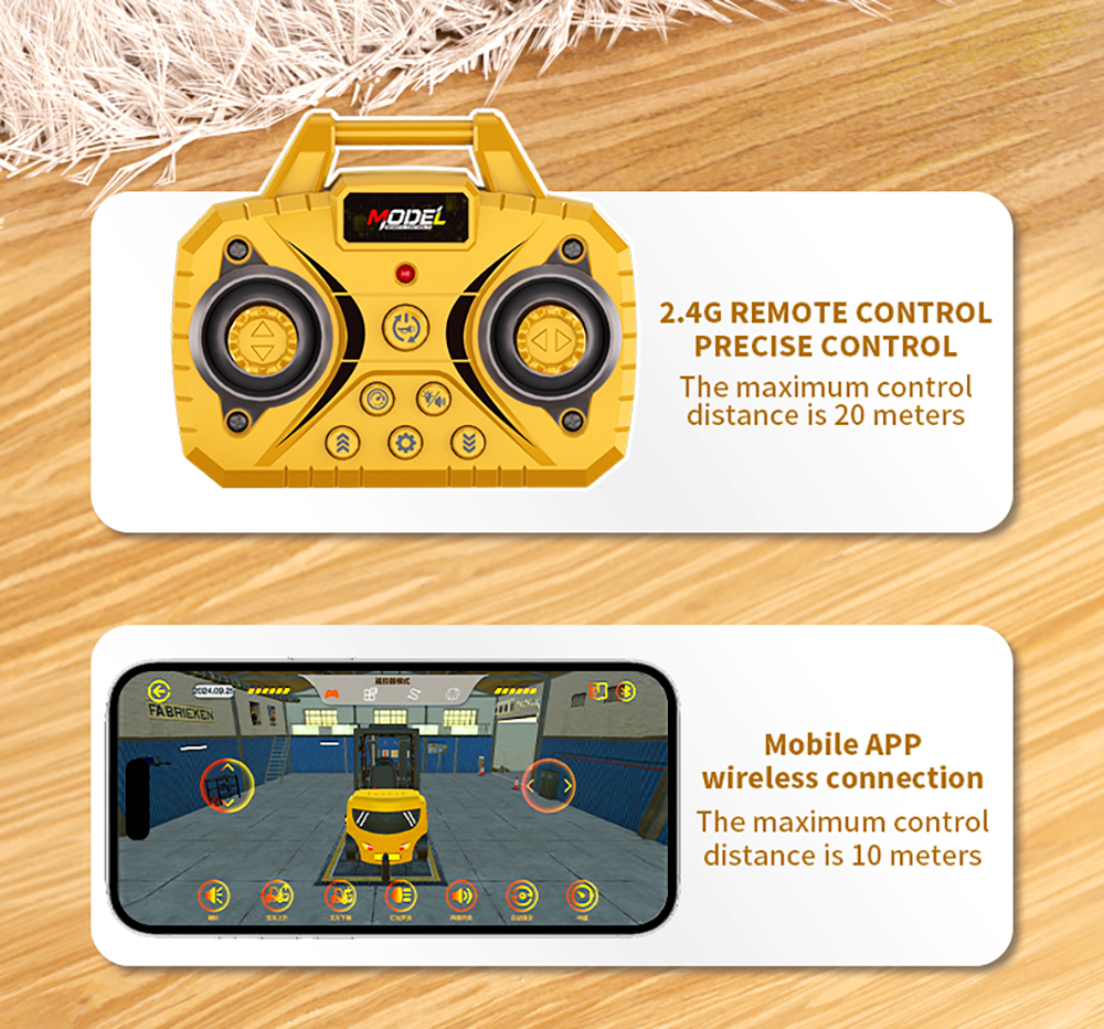 Mini simulation model, alloy body and fork, with lighting and sound effects; Equipped with forward and backward, left and right turn, lighting, music, horn, up and down, speed adjustment, and automatic demonstration functions; Support mobile app connection, made of alloy material, easy to replace accessories.