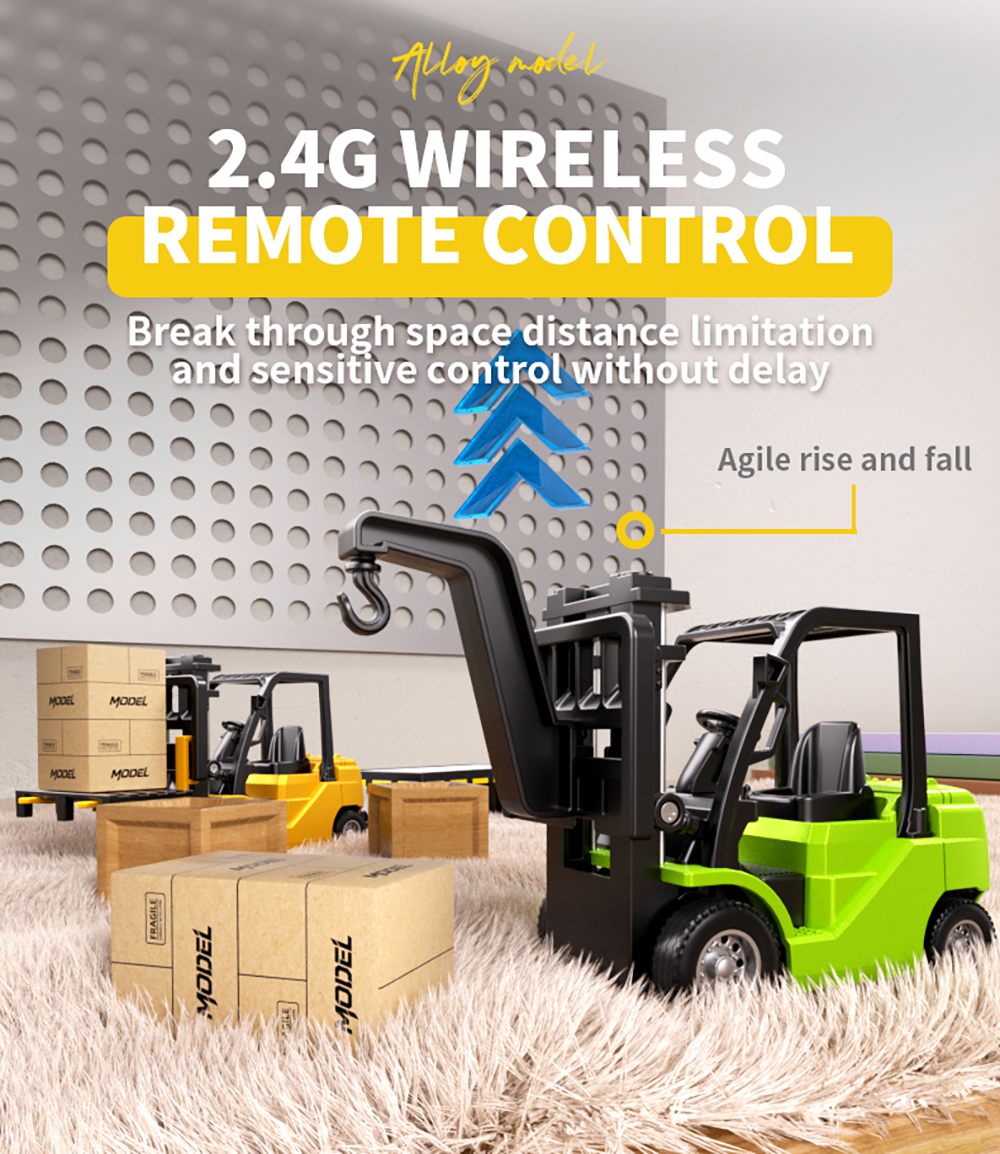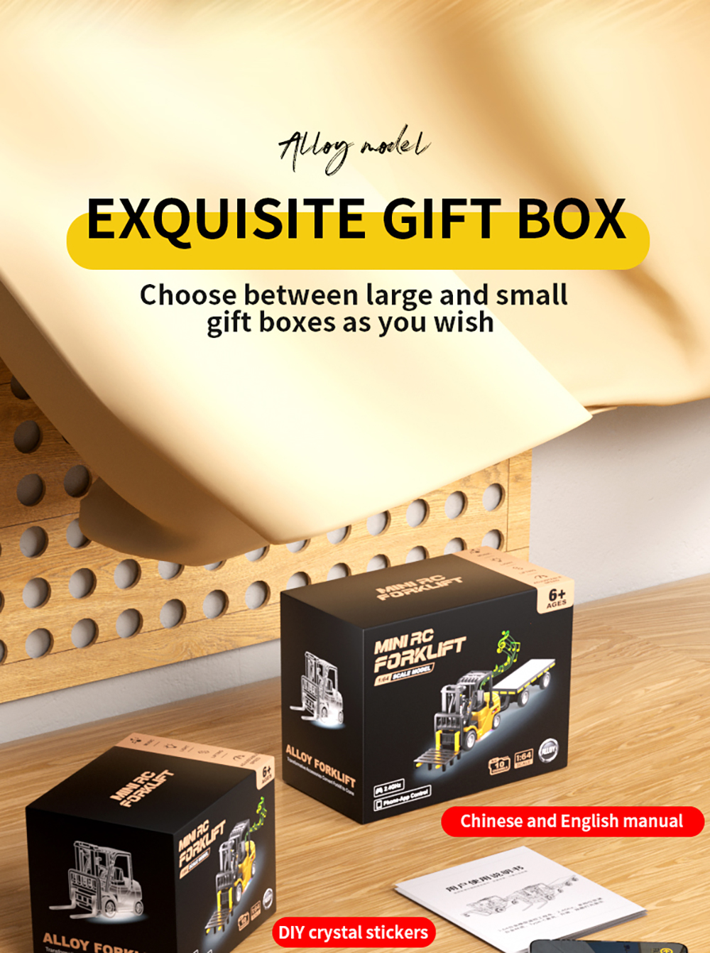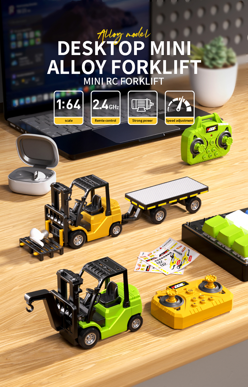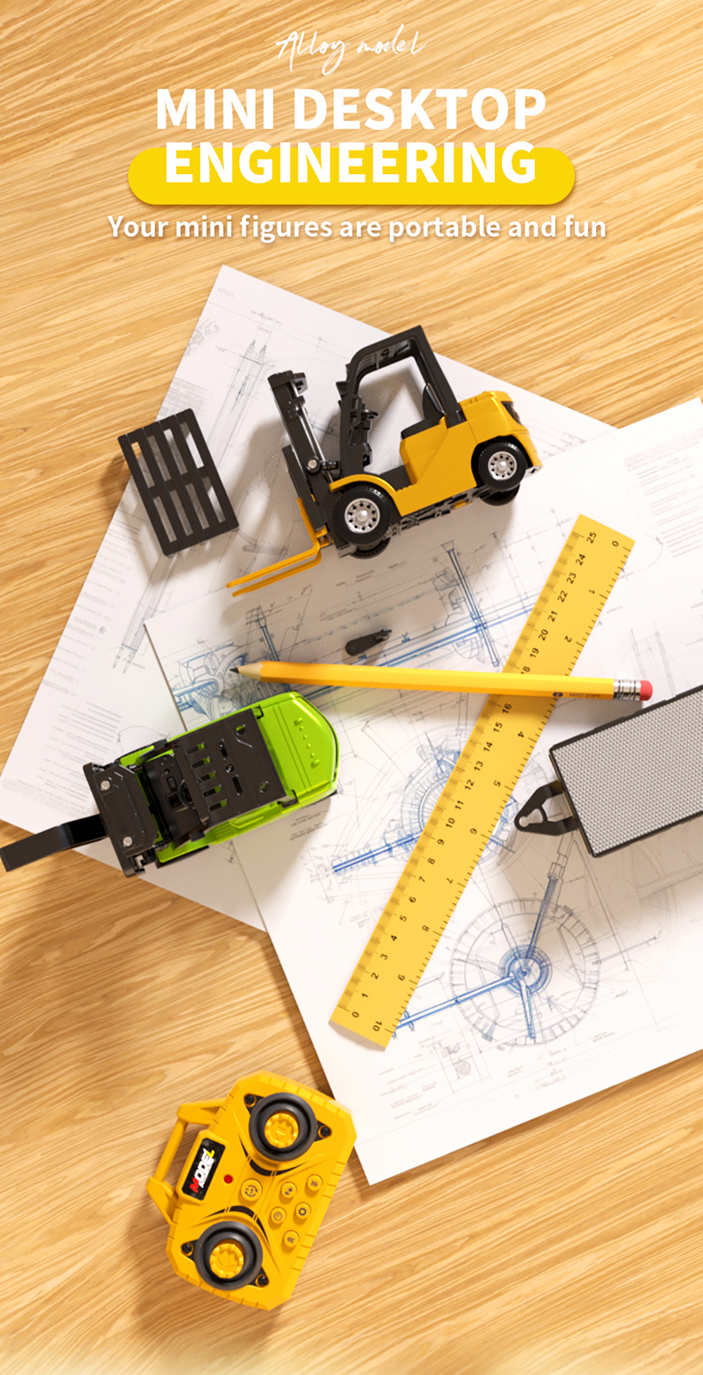Mini simulation model, alloy body and fork, with lighting and sound effects; Equipped with forward and backward, left and right turn, lighting, music, horn, up and down, speed adjustment, and automatic demonstration functions; Support mobile app connection, made of alloy material, easy to replace accessories.