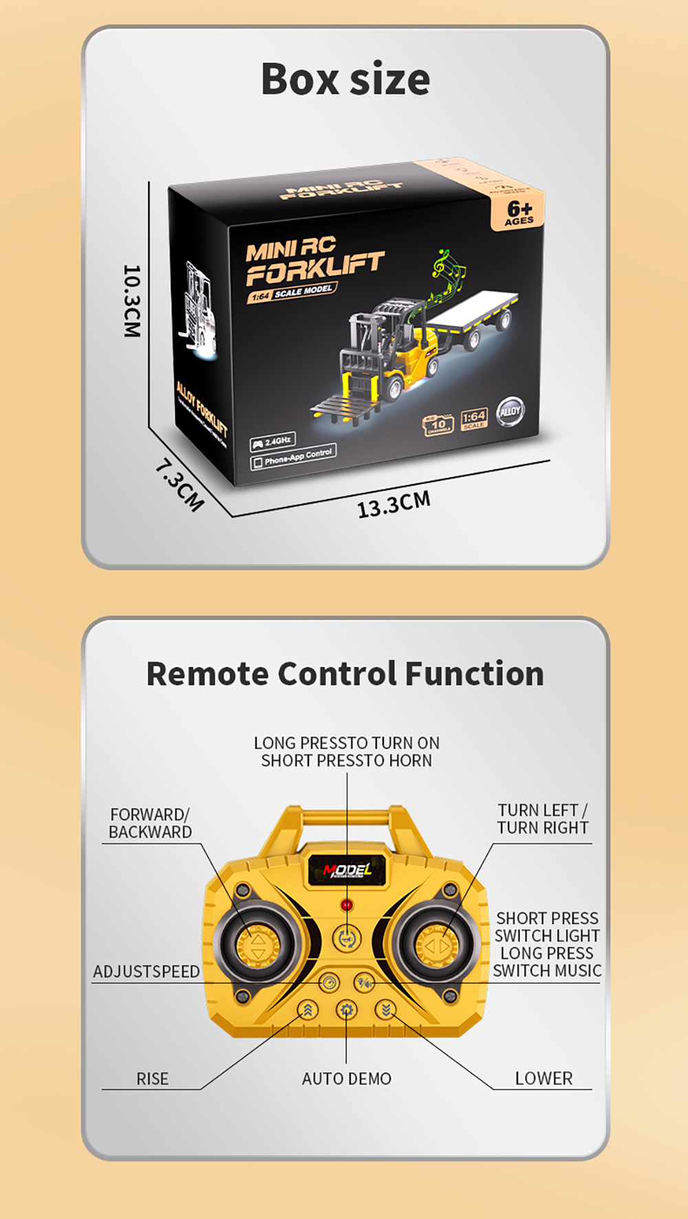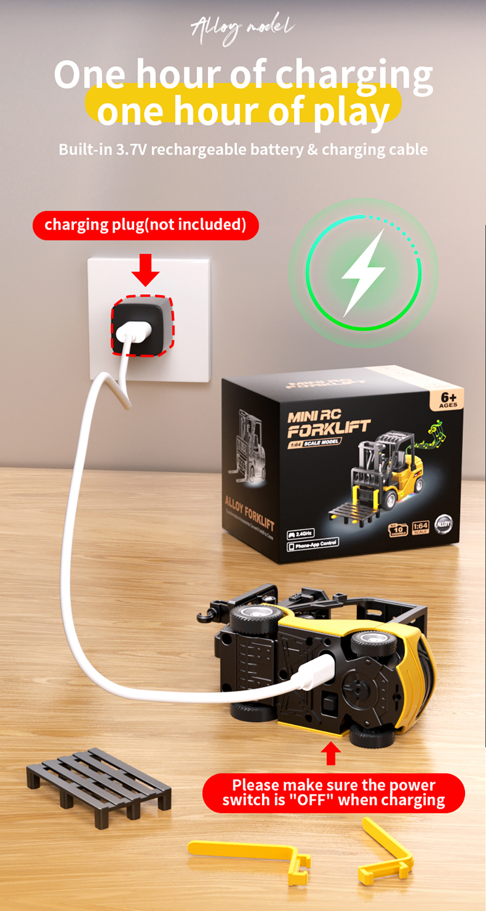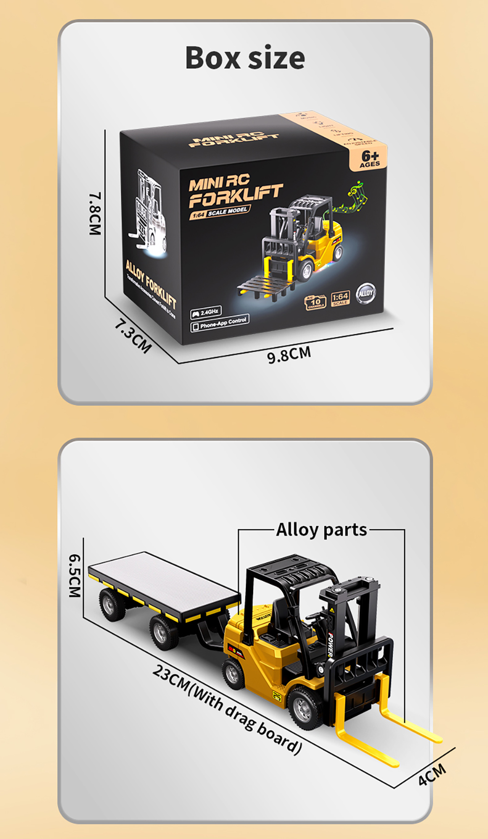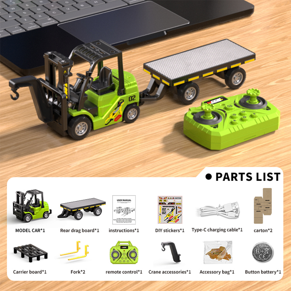 Mini simulation model, alloy body and fork, with lighting and sound effects; Equipped with forward and backward, left and right turn, lighting, music, horn, up and down, speed adjustment, and automatic demonstration functions; Support mobile app connection, made of alloy material, easy to replace accessories.