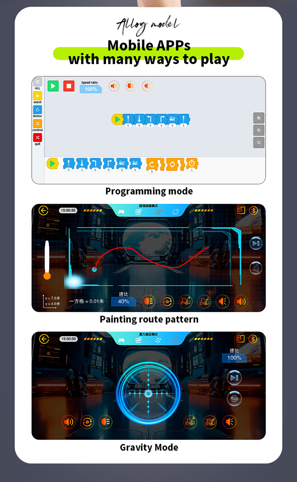 7. Forward, backward, left turn, right turn, light, music, speaker, rise, fall, three-speed speed adjustment, automatic demonstration