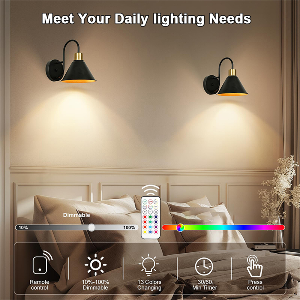 Remote Control & 2 Timer Control: Control both battery operated sconces effortlessly with the included remote.The maximum distance controlled by the remote control is 14.76ft. Enjoy dimmable lighting and color settings that create a nice atmosphere without straining your eyes. With timer features, allows you set the timer for 30, 60 mins for bedtime lighting, ensures automatic shutoff for energy-saving convenience.