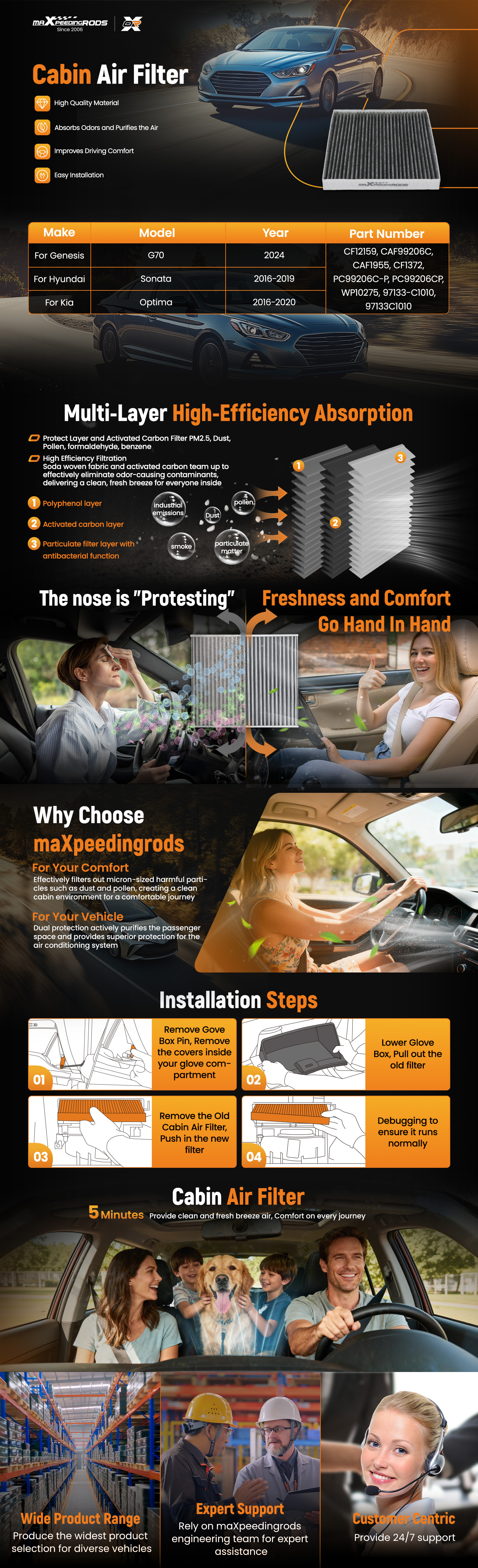 Filter Dust & Pollen: Cabin air filter has long-fiber layer of electrostatic cotton firmly on the surface of the fabric, provides a comfortable interior environment for you and your family.