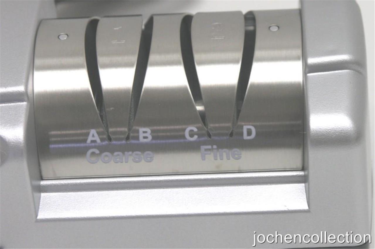Q 7: Hi I just bought a new Chef's Choice electric knife sharpener and it does not work well at all. It uses diamond honing and again it doesn't work so it's going back. I DO NOT want to buy another knife sharpener that doesn't work. Have you used the same type of sharpener you're selling on ebay? What can you tell me that would convince me yours will work when the Chef's Choice did not? You can look into my eBay profile to see that I am a very honest person BUT again I need to know if the item you're selling will sharpen a knife perfectly. thanks Chuck